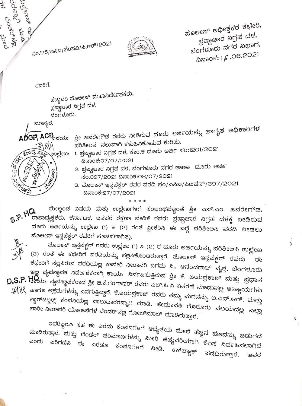 ಕಾವೇರಿ ನೀರಾವರಿ ನಿಗಮದ ವ್ಯವಸ್ಥಾಪಕ ನಿರ್ದೇಶಕ ಕೆ ಜಯಪ್ರಕಾಶ್ ಮತ್ತು ಪ್ರಧಾನ ವ್ಯವಸ್ಥಾಪಕ ಗಂಗಾಧರ್ ಅವರ ವಿರುದ್ಧ ಜವರೇಗೌಡ ಎಂಬುವರು ಎಸಿಬಿಗೆ ದೂರು ಸಲ್ಲಿಸಿದ್ದರು. ಭಾರೀ ನೀರಾವರಿ ಯೋಜನೆಗಳ ಟೆಂಡರ್ ಮತ್ತು ಎಲ್ಒಸಿ ಬಿಡುಗಡೆಯಲ್ಲಿ ದೊಡ್ಡಮೊತ್ತದ ಕಿಕ್ ಬ್ಯಾಕ್ ಪಡೆದಿದ್ದಾರೆ ಎಂದು ದೂರಿನಲ್ಲಿ ವಿವರಿಸಿದ್ದರು. ಈ ದೂರು ಭ್ರಷ್ಟಾಚಾರ ನಿಗ್ರಹ ಕಾಯ್ದೆ ವ್ಯಾಪ್ತಿಗೆ ಒಳಪಡದ ಕಾರಣ ಎಸಿಬಿಯ ಎಡಿಜಿಪಿಗೆ ಎಸ್ಪಿ ಯತೀಶ್ಚಂದ್ರ ಅವರು 2021ರ ಆಗಸ್ಟ್ 16ರಂದು ಪತ್ರ ಬರೆದಿದ್ದರು. ಈ ಪತ್ರದ ಪ್ರತಿ ‘ದಿ ಫೈಲ್’ಗೆ ಲಭ್ಯವಾಗಿದೆ.