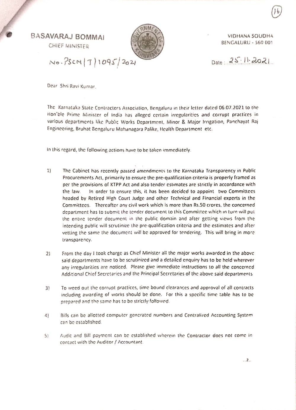 ಟೆಂಡರ್ ಪ್ರಕ್ರಿಯೆಯಲ್ಲಿ ಹಗರಣದ ಹಾಗೂ ಶೇ. 40ರಷ್ಟು ಕಮಿಷನ್‌ಗೆ ವಿಚಾರವಾಗಿ ಗುತ್ತಿಗೆದಾರರ ಸಂಘವು ಪ್ರಧಾನಿ ನರೇಂದ್ರ ಮೋದಿಗೆ ಪತ್ರ ಬರೆದ ವಿಚಾರದ ಕುರಿತು ತನಿಖೆ ನಡೆಸಿ ವರದಿ ಸಲ್ಲಿಸಬೇಕು ಎಂದು ಮುಖ್ಯಮಂತ್ರಿ ಬಸವರಾಜ ಬೊಮ್ಮಾಯಿ ಅವರು ಮುಖ್ಯ ಕಾರ್ಯದರ್ಶಿ ರವಿಕುಮಾರ್‌ ಅವರಿಗೆ ಸೂಚಿಸಿದ್ದರು.