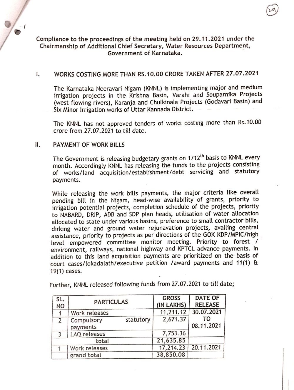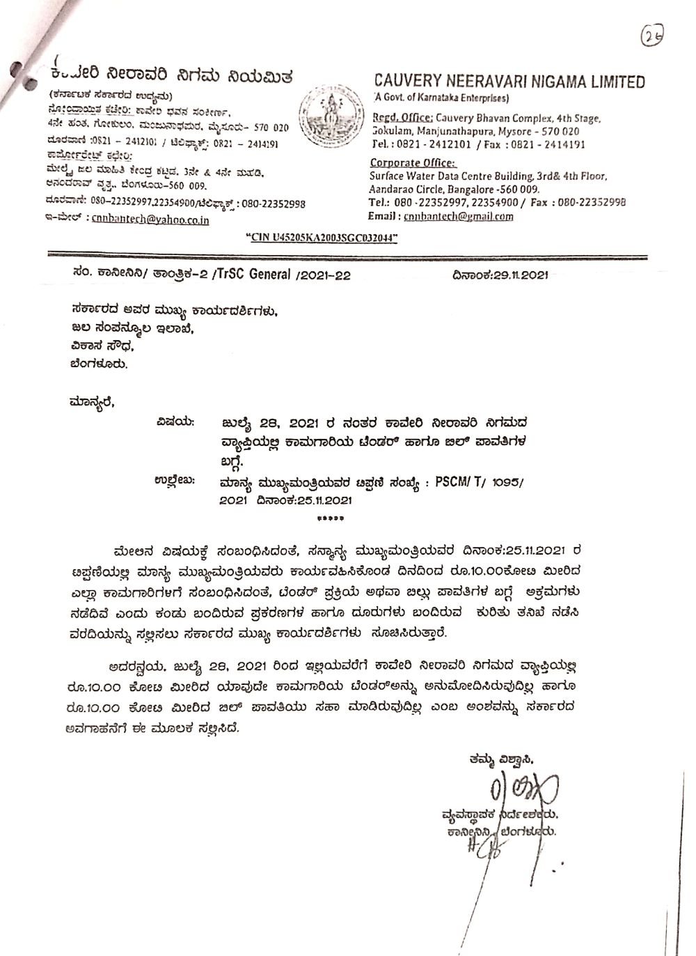 2021ರ ಜುಲೈ 28ರಿಂದ ಇಲ್ಲಿಯವರೆಗೆ ಕಾವೇರಿ ನೀರಾವರಿ ನಿಗಮದ ವ್ಯಾಪ್ತಿಯಲ್ಲಿ 10.00 ಕೋಟಿ ಮೀರಿದ ಯಾವುದೇ ಕಾಮಗಾರಿಯ ಟೆಂಡರ್‌ನ್ನು ಅನುಮೋದಿಸಿರುವುದಿಲ್ಲ. ಹಾಗೂ 10.00 ಕೋಟಿ ಮೀರಿದ ಬಿಲ್‌ ಪಾವತಿಯೂ ಸಹ ಮಾಡಿರುವುದಿಲ್ಲ ಎಂದು 2021ರ ನವೆಂಬರ್‌ 29ರಂದು ಮಾಹಿತಿ ಒದಗಿಸಿದೆ.