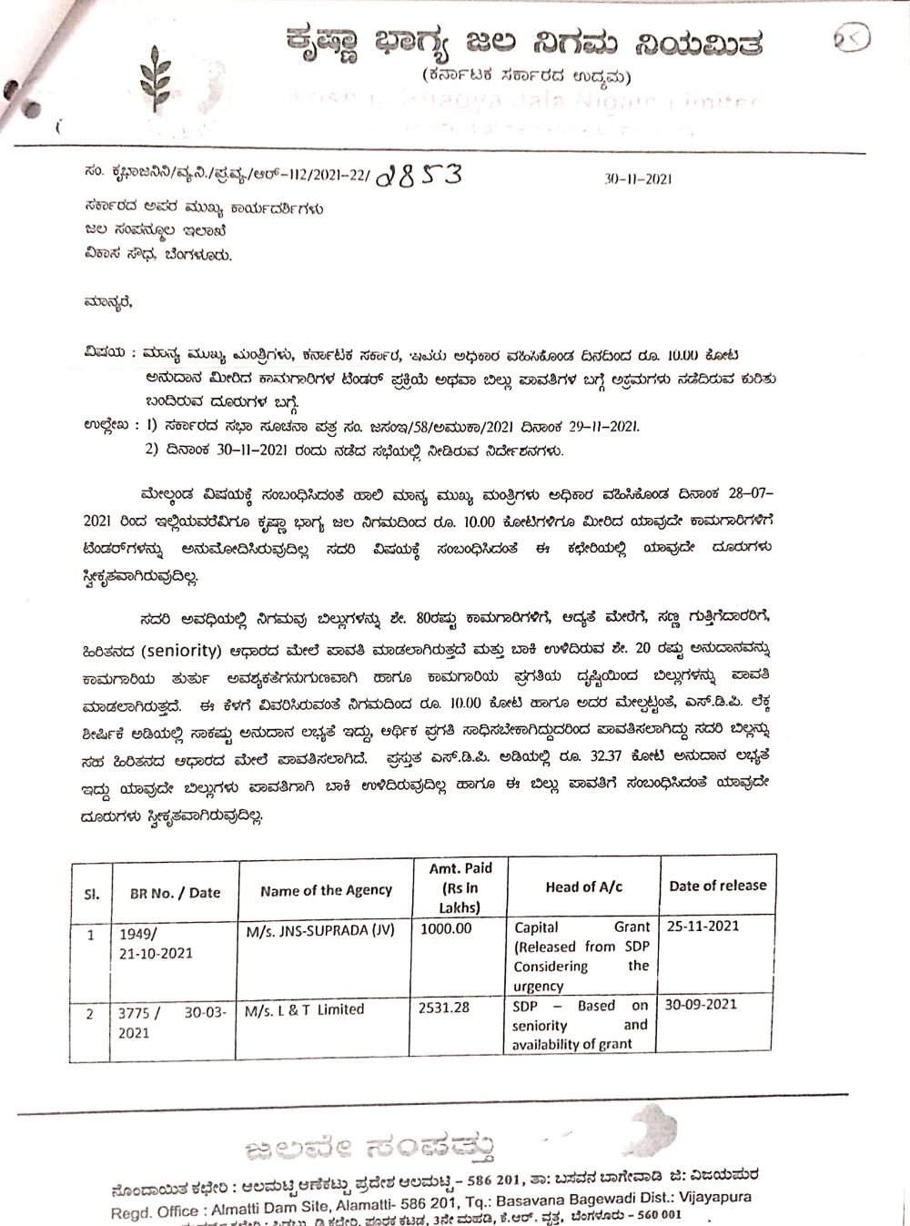ಕೃಷ್ಣಭಾಗ್ಯಜಲನಿಗಮ ನೀಡಿರುವ ಉತ್ತರದ ಪ್ರತಿ