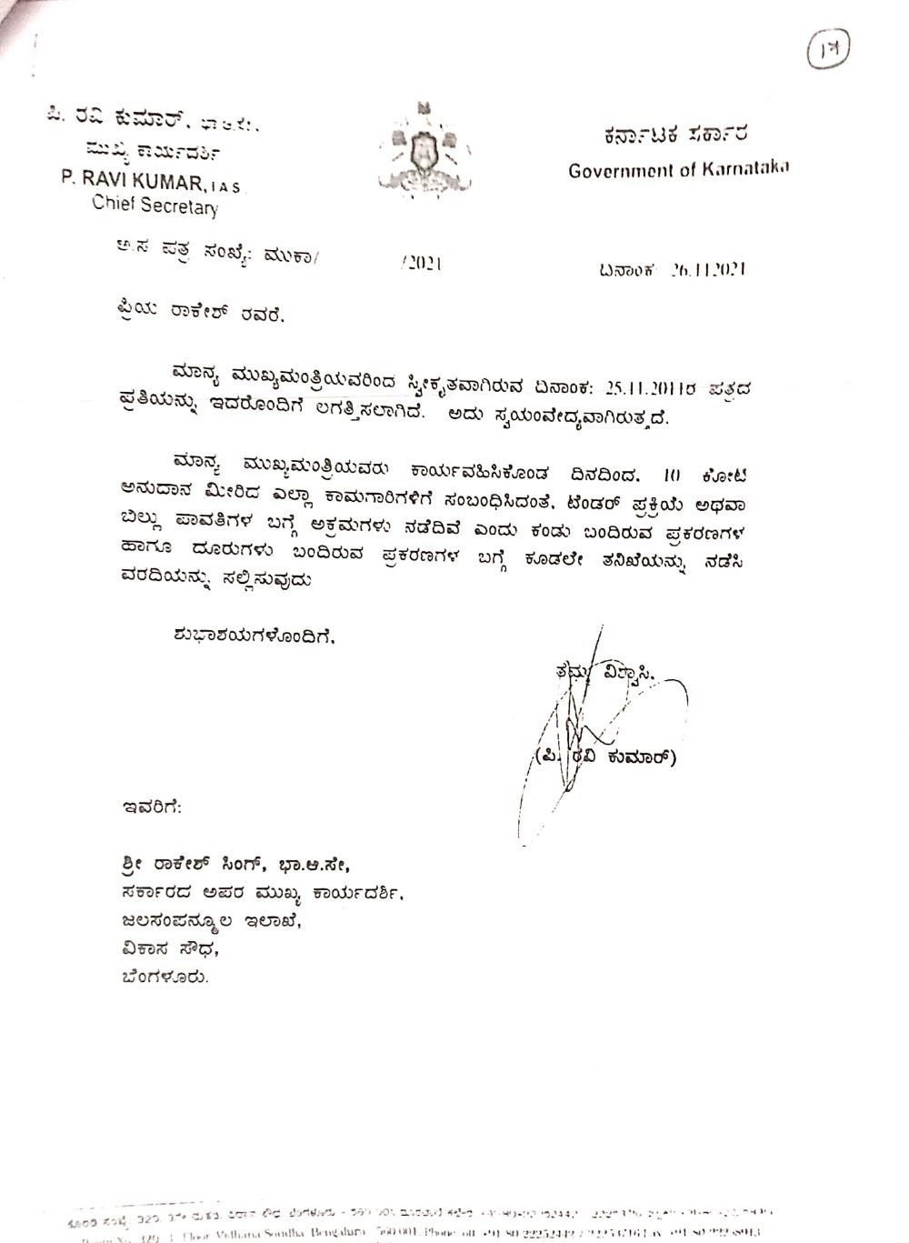 ಮುಖ್ಯ ಕಾರ್ಯದರ್ಶಿ ರವಿಕುಮಾರ್‌, ರಾಕೇಶ್‌ಸಿಂಗ್‌ ಅವರಿಗೆ ಬರೆದಿರುವ ಪತ್ರ