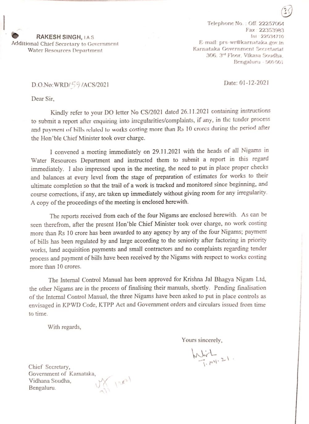 ಕರ್ನಾಟಕ ನೀರಾವರಿ ನಿಗಮ, ಕೃಷ್ಣಭಾಗ್ಯ ಜಲನಿಗಮ, ಕಾವೇರಿ ಜಲನಿಗಮ, ವಿಶ್ವೇಶ್ವರಯ್ಯ ಜಲನಿಗಮದ ವ್ಯವಸ್ಥಾಪಕ ನಿರ್ದೇಶಕರು ನವೆಂಬರ್‌ ಮತ್ತು ಡಿಸೆಂಬರ್‌ನಲ್ಲಿ ವರದಿ ಸಲ್ಲಿಸಿದ್ದಾರೆ. ಇದನ್ನಾಧರಿಸಿ ರಾಕೇಶ್‌ಸಿಂಗ್‌ ಅವರು 2021ರ ಡಿಸೆಂಬರ್‌ 01ರಂದೇ ವರದಿ ಸಲ್ಲಿಸಿದ್ದಾರೆ. ನಾಲ್ಕೂ ನಿಗಮಗಳೂ ಕೆಪಿಡಬ್ಲ್ಯೂಡಿ ಕೋಡ್‌ ಮತ್ತು ಕೆಟಿಪಿಪಿ ಕಾಯ್ದೆ ಮತ್ತು ರಾಜ್ಯ ಸರ್ಕಾರವು ಕಾಲಕಾಲಕ್ಕೆ ಹೊರಡಿಸಿರುವ ಆದೇಶ ಮತ್ತು ಸುತ್ತೋಲೆಗಳನ್ನು ಪಾಲಿಸುತ್ತಿವೆ ಎಂದು ವರದಿಯಲ್ಲಿ ಪ್ರಸ್ತಾಪಿಸಿದ್ದಾರೆ.