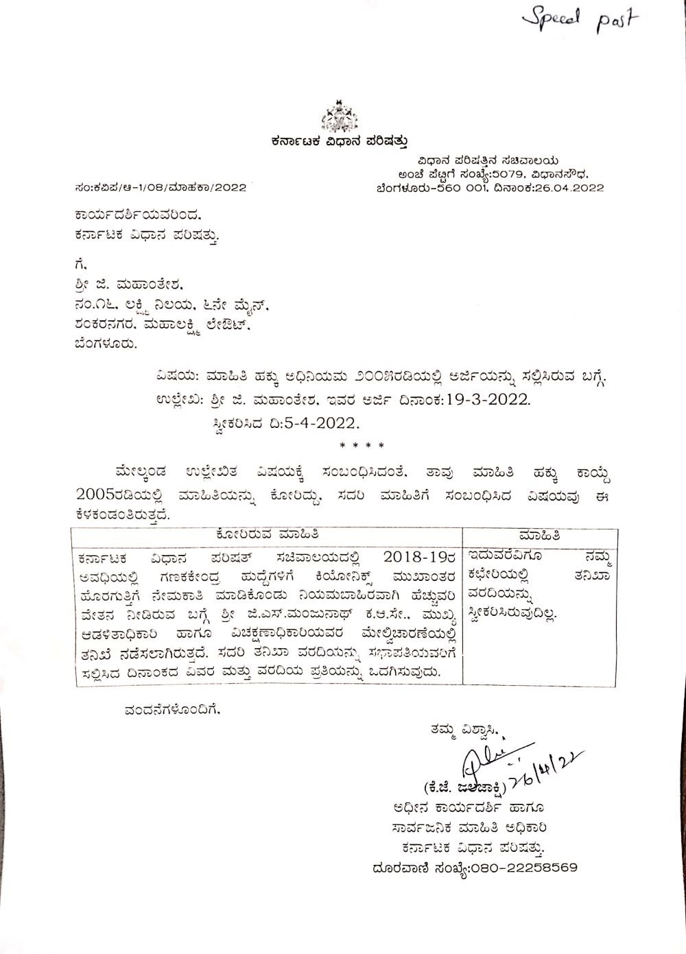 ಬೆಂಗಳೂರು; ಕರ್ನಾಟಕ ವಿಧಾನಪರಿಷತ್ ಸಚಿವಾಲಯದ ಗಣಕ ಕೇಂದ್ರಕ್ಕೆ 2018-19ನೇ ಸಾಲಿನಲ್ಲಿ ಹೊರಗುತ್ತಿಗೆಯಡಿಯಲ್ಲಿ ನೇಮಕವಾದ ಸಿಬ್ಬಂದಿಗೆ ನಿಯಮಬಾಹಿರವಾಗಿ ಹೆಚ್ಚುವರಿ ವೇತನ ನೀಡಿದ್ದರ ಕುರಿತು ಸಲ್ಲಿಕೆಯಾಗಿದ್ದ ತನಿಖಾ ವರದಿಯನ್ನೇ ಮುಚ್ಚಿಡಲಾಗಿದೆ. ಅಲ್ಲದೆ ತನಿಖಾ ವರದಿಯು ಇದುವರೆಗೂ ಸ್ವೀಕೃತವಾಗಿಲ್ಲ ಎಂದು ವಿಧಾನಪರಿಷತ್ ಸಚಿವಾಲಯವು ಆರ್ಟಿಐ ಅಡಿಯಲ್ಲಿ ತಪ್ಪು ಮಾಹಿತಿ ನೀಡಿದೆ.