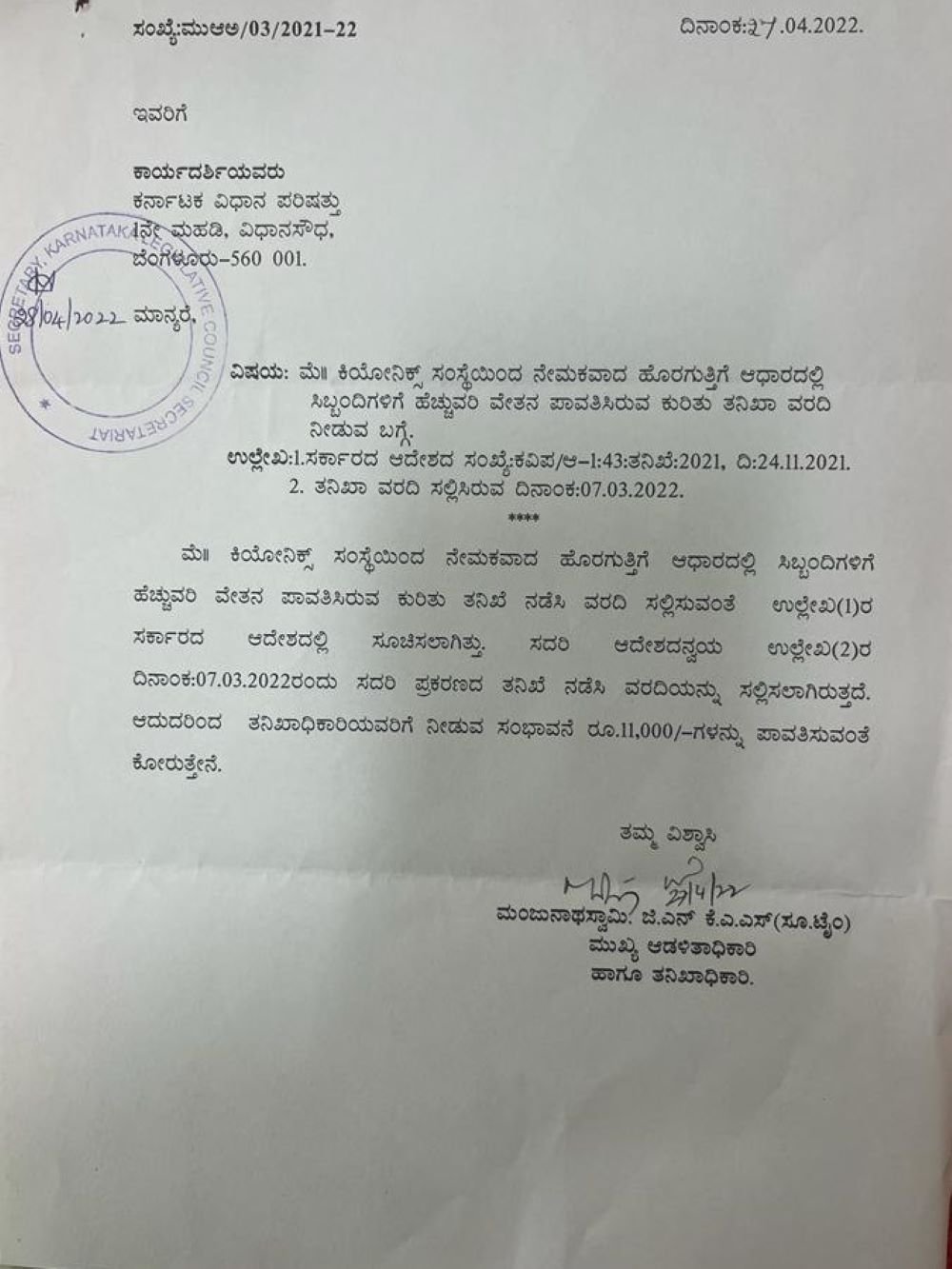 ‘ಕಿಯೋನಿಕ್ಸ್ ಸಂಸ್ಥೆಯಿಂದ ನೇಮಕವಾದ ಹೊರಗುತ್ತಿಗೆ ಅಧಾರದಲ್ಲಿ ಸಿಬ್ಬಂದಿಗಳಿಗೆ ಹೆಚ್ಚುವರಿ ವೇತನ ಪಾವತಿಸಿರುವ ಕುರಿತು ತನಿಖೆ ನಡೆಸಿ ವರದಿ ಸಲ್ಲಿಸುವಂತೆ ಸರ್ಕಾರದ ಆದೇಶದಲ್ಲಿ ಸೂಚಿಸಲಾಗಿತ್ತು. ಅದರಂತೆ ಪ್ರಕರಣದ ಕುರಿತು 2022ರ ಮಾರ್ಚ್ 7ರಂದು ತನಿಖೆ ನಡೆಸಿ ವರದಿಯನ್ನು ಸಲ್ಲಿಸಲಾಗಿರುತ್ತದೆ. ಆದ್ದರಿಂದ ತನಿಖಾಧಿಕಾರಿಯವರಿಗೆ ನೀಡುವ ಸಂಭಾವನೆ 11,000 ರು.ಗಳನ್ನು ಪಾವತಿಸಬೇಕು,’ ಎಂದು ತನಿಖಾಧಿಕಾರಿ ಜಿ ಎನ್ ಮಂಜುನಾಥಸ್ವಾಮಿ ಅವರು 2022ರ ಏಪ್ರಿಲ್ 27ರಂದು ವಿಧಾನ ಪರಿಷತ್ ಕಾರ್ಯದರ್ಶಿಗೆ ಪತ್ರ ಬರೆದಿದ್ದರು. ಈ ಪತ್ರದ ಆಧಾರದ ಮೇಲೆ ಇದುವರೆಗೂ ಯಾವುದೇ ಕ್ರಮ ವಹಿಸಿಲ್ಲ ಎಂದು ಗೊತ್ತಾಗಿದೆ.