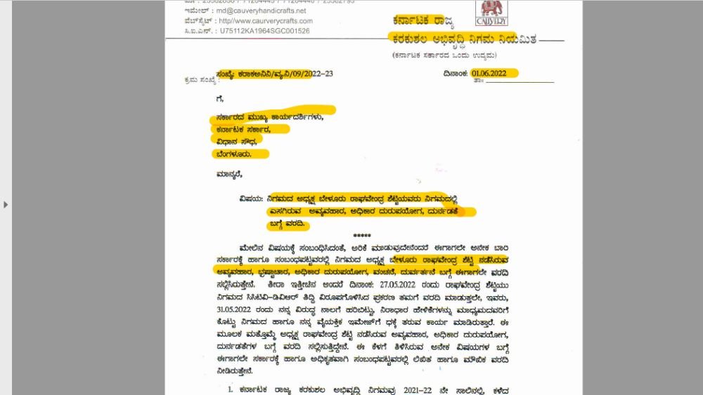 ನಿಗಮದಲ್ಲಿ ನಡೆಯುತ್ತಿರುವ ಈ ಎಲ್ಲಾ ಬೆಳವಣಿಗೆಗಳ ಕುರಿತು ನಿಗಮದ ಹಾಲಿ ವ್ಯವಸ್ಥಾಪಕ ನಿರ್ದೇಶಕರೂ ಆಗಿರುವ ಹಿರಿಯ ಐಪಿಎಸ್‌ ಅಧಿಕಾರಿ ಡಿ ರೂಪಾ ಮೌದ್ಗಿಲ್‌ ಅವರು ಮುಖ್ಯ ಕಾರ್ಯದರ್ಶಿಗೆ 2022ರ ಜೂನ್‌ 1ರಂದು 6 ಪುಟಗಳ ಪತ್ರ ಬರೆದು ಗಮನ ಸೆಳೆದಿದ್ದಾರೆ. ಈ ಪತ್ರದ ಪ್ರತಿ ‘ದಿ ಫೈಲ್‌’ಗೆ ಲಭ್ಯವಾಗಿದೆ.