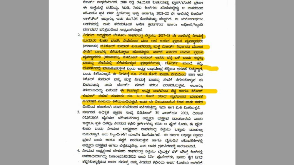 ಅಲ್ಲದೆ ‘ನಿಗಮದ ದೈನಂದಿನ ಚಟುವಟಿಕೆಗಳಲ್ಲಿ ಅಧ್ಯಕ್ಷರು ಹಸ್ತಕ್ಷೇಪ ಮಾಡಬಾರದು ಎಂದು 2003ರ ಮೇ 7ರಂದು ಹೊರಡಿಸಿರುವ ಅಧಿಕೃತ ಜ್ಞಾಪನ ಪತ್ರದಲ್ಲಿ ಸೂಚಿಸಿದ್ದರೂ ಪ್ರತಿ ದಿನವೂ ನಿಗಮದ ಕಚೇರಿ ಕ್ಲರ್ಕ್‌ಗಳನ್ನು ಕರೆದು ಆ ಫೈಲ್‌ ಕೊಡು, ಈ ಫೈಲ್‌ ಕೊಡು ಎಂದು ರಾಘವೇಂದ್ರ ಶೆಟ್ಟಿ ಒತ್ತಾಯ ಮಾಡುತ್ತಿದ್ದಾರೆ,’ ಎಂದೂ ಮುಖ್ಯಕಾರ್ಯದರ್ಶಿಗೆ ಬರೆದ ದೂರಿನಲ್ಲಿ ವಿವರಿಸಿದ್ದಾರೆ.
