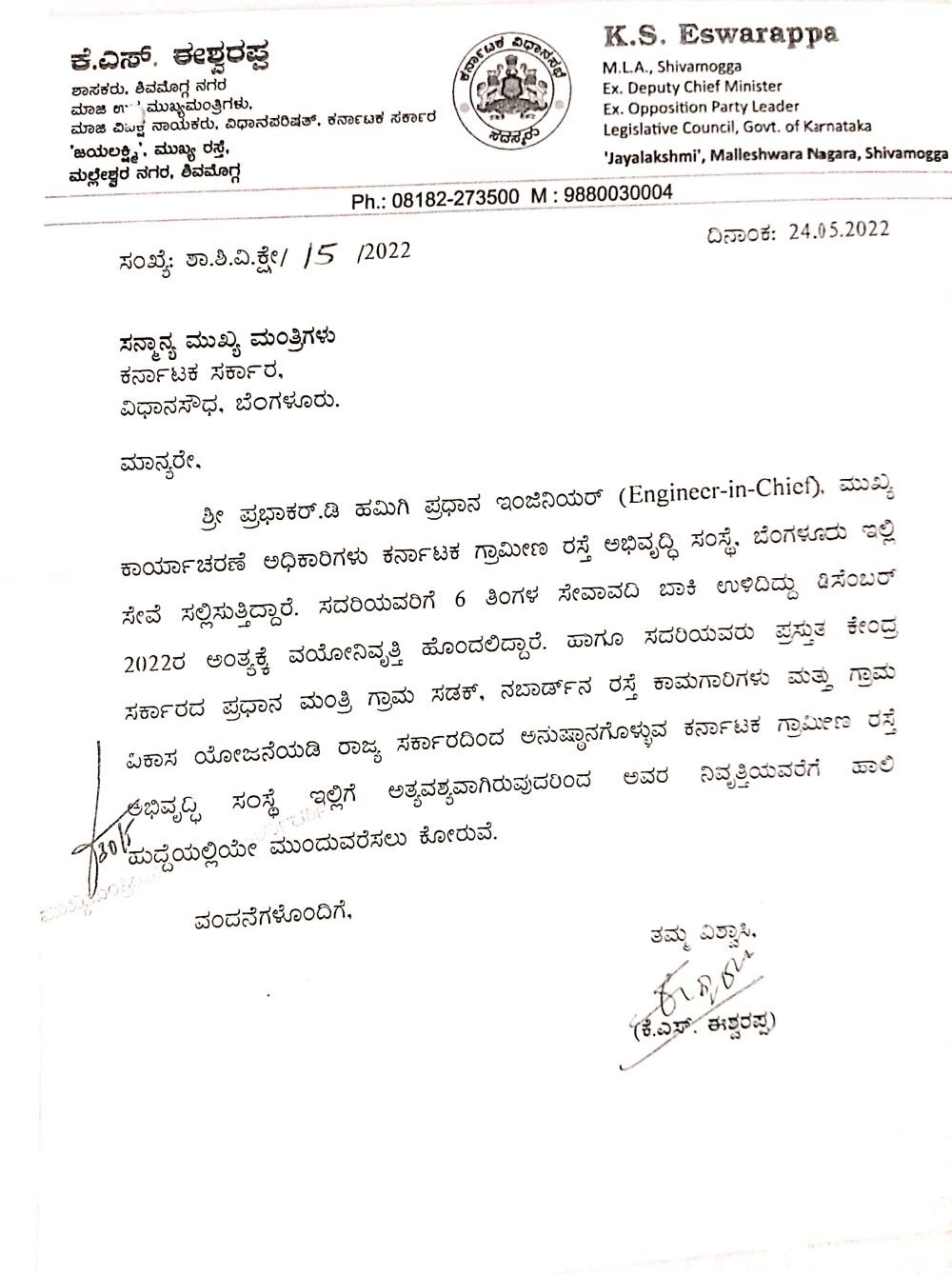 ಕರ್ನಾಟಕ ಗ್ರಾಮೀಣ ರಸ್ತೆ ಅಭಿವೃದ್ದಿ ಸಂಸ್ಥೆಯಲ್ಲಿ ಪ್ರಧಾನ ಇಂಜಿನಿಯರ್ ಆಗಿರುವ ಪ್ರಭಾಕರ್ ಡಿ ಹಮಿಗೆ ಅವರು ಇದೇ ಡಿಸೆಂಬರ್ 2022ರ ಅಂತ್ಯಕ್ಕೆ ನಿವೃತ್ತಿಯಾಗುತ್ತಿದ್ದಾರೆ. ಅವರ ನಿವೃತ್ತಿಯವರೆಗೆ ಹಾಲಿ ಹುದ್ದೆಯಲ್ಲಿಯೇ ಮುಂದುವರೆಸಬೇಕು ಎಂದು ಕೆ ಎಸ್ ಈಶ್ವರಪ್ಪ ಅವರು ಪ್ರಭಾವ ಬೀರಿದ್ದಾರೆ. ಈ ಸಂಬಂಧ 2022ರ ಮೇ 24ರಂದು ಮುಖ್ಯಮಂತ್ರಿ ಬಸವರಾಜ ಬೊಮ್ಮಾಯಿ ಅವರಿಗೆ ಪತ್ರವನ್ನೂ ಬರೆದಿದ್ದಾರೆ. ಈ ಪತ್ರದ ಪ್ರತಿ ‘ದಿ ಫೈಲ್’ಗೆ ಲಭ್ಯವಾಗಿದೆ.