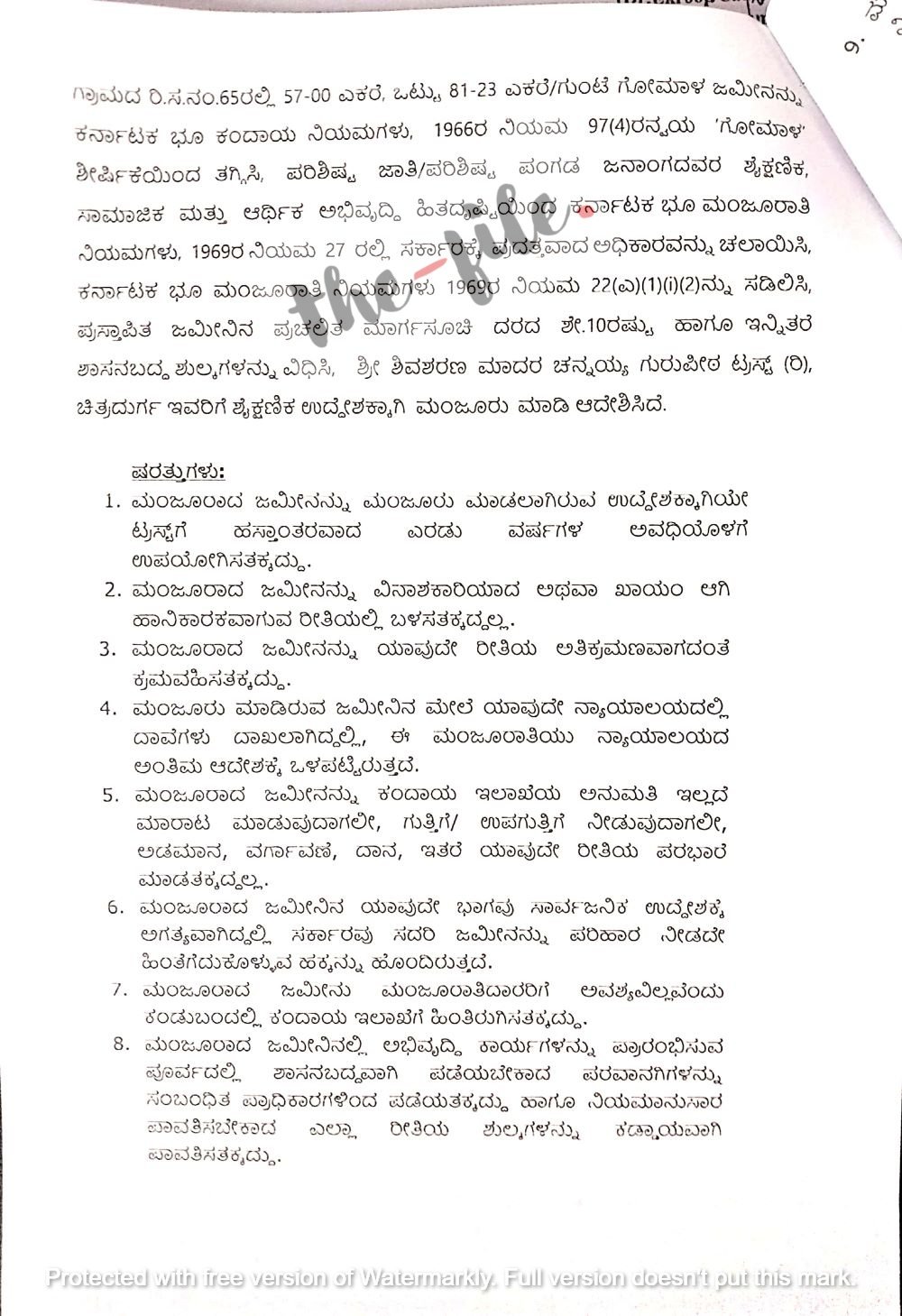 ಇದನ್ನಾಧರಿಸಿ ‘ಕರ್ನಾಟಕ ಭೂ ಕಂದಾಯ ನಿಯಮಗಳು 1966ರ ನಿಯಮ 97(4)ರ ಅನ್ವಯ ಗೋಮಾಳ ಶೀರ್ಷಿಕೆಯಿಂದ ತಗ್ಗಿಸಿ ಪರಿಶಿಷ್ಟ ಜಾತಿ ಮತ್ತು ಪರಿಶಿಷ್ಟ ಪಂಗಡ ಜನಾಂಗದವರ ಶೈಕ್ಷಣಿಕ ಮತ್ತು ಆರ್ಥಿಕ ಅಭಿವೃದ್ಧಿ ಹಿತದೃಷ್ಟಿಯಿಂದ ಕರ್ನಾಟಕ ಭೂಮಂಜೂರಾತಿ ನಿಯಮಗಳು 1969ರನಿಯಮ 27ರಲ್ಲಿ ಸರ್ಕಾರಕ್ಕೆ ಪ್ರದತ್ತವಾದ ಅಧಿಕಾರ ಚಲಾಯಿಸಿ ಕರ್ನಾಟಕ ಭೂ ಮಂಜೂರಾತಿ ನಿಯಮಗಳು 1969ರ ನಿಯಮ 22(ಎ)(1)(i)(2) ಸಡಿಲಿಸಿ ಪ್ರಸ್ತಾಪಿತ ಜಮೀನಿನ ಪ್ರಚಲಿತ ಮಾರ್ಗಸೂಚಿ ದರದ ಶೇ.10ರಷ್ಟು ಹಾಗೂ ಇನ್ನಿತರೆ ಶಾಸನಬದ್ಧ ಶುಲ್ಕಗಳನ್ನು ವಿಧಿಸಿ ಶಿವಶರಣ ಮಾದರ ಚೆನ್ನಯ್ಯ ಗುರುಪೀಠ ಟ್ರಸ್ಟ್‌ಗೆ ಶೈಕ್ಷಣಿಕ ಉದ್ದೇಶಕ್ಕಾಗಿ ಮಂಜೂರು ಮಾಡಲಾಗಿದೆ,’ ಎಂದು ಆದೇಶದಲ್ಲಿ ವಿವರಿಸಿದೆ.