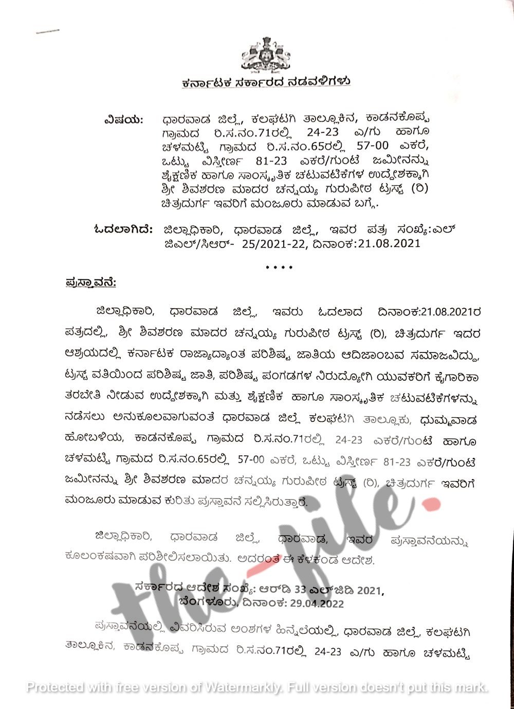 ಚಿತ್ರದುರ್ಗದಲ್ಲಿರುವ ಶ್ರೀ ಶಿವಶರಣ ಮಾದರ ಚೆನ್ನಯ್ಯ ಗುರುಪೀಠ ಟ್ರಸ್ಟ್‌ಗೆ ಶೈಕ್ಷಣಿಕ ಮತ್ತು ಸಾಂಸ್ಕೃತಿಕ ಚಟುವಟಿಕೆಗಳನ್ನು ನಡೆಸಲು ಅನುಕೂಲವಾಗುವಂತೆ ಧಾರವಾಡ ಜಿಲ್ಲೆಯ ಕಲಘಟಗಿ ತಾಲೂಕಿನ ಕಾಡನಕೊಪ್ಪ ಗ್ರಾಮದ ಸರ್ವೆ ನಂಬರ್‌ 71ರಲ್ಲಿ 24.23 ಎಕರೆ ಮತ್ತು ಚಳಮಟ್ಟಿ ಗ್ರಾಮದ ಸರ್ವೆ ನಂಬರ್‌ 65ರಲ್ಲಿ 57.00 ಎಕರೆ ಸೇರಿ ಒಟ್ಟಾರೆ 81.23 ಎಕರೆ ಜಮೀನನ್ನು ಟ್ರಸ್ಟ್‌ಗೆ ಮಂಜೂರು ಮಾಡಬೇಕು ಎಂದು 2021ರ ಆಗಸ್ಟ್‌ 8ರಂದು ಪ್ರಸ್ತಾವನೆ ಸಲ್ಲಿಕೆಯಾಗಿತ್ತು ಎಂಬುದು ಆದೇಶದ ನಡವಳಿಯಿಂದ ತಿಳಿದು ಬಂದಿದೆ.