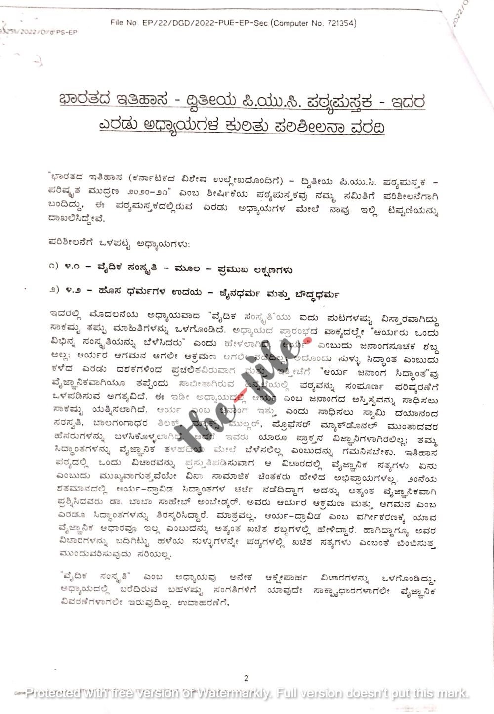 ಭಾರತದ ಇತಿಹಾಸ (ಕರ್ನಾಟಕ ವಿಶೇಷ ಉಲ್ಲೇಖದೊಂದಿಗೆ) ಪಠ್ಯಪುಸ್ತಕದಲ್ಲಿನ ವೈದಿಕ ಸಂಸ್ಕೃತಿ, ಮೂಲ, ಪ್ರಮುಖ ಲಕ್ಷಣಗಳು, ಹೊಸ ಧರ್ಮಗಳ ಉದಯ, ಜೈನಧರ್ಮ ಮತ್ತು ಬೌದ್ಧ ಧರ್ಮದ ಅಧ್ಯಾಯವನ್ನು ಪರಿಶೀಲಿಸಿ ಸರ್ಕಾರಕ್ಕೆ ಸಲ್ಲಿಸಿದ್ದ ವರದಿಯಲ್ಲಿ ಈ ಅಂಶವಿದೆ. ಪರಿಶೀಲನಾ ವರದಿಯನ್ನು ‘ದಿ ಫೈಲ್’ ಆರ್ಟಿಐ ಅಡಿಯಲ್ಲಿ ಪಡೆದುಕೊಂಡಿದೆ.
