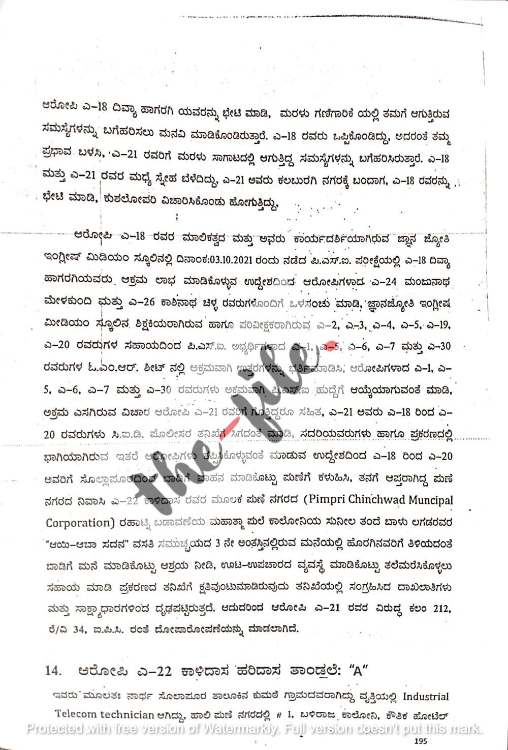 ‘ತನಗೆ ಆಪ್ತರಾಗಿದ್ದ ಪುಣೆ ನಗರದ ನಿವಾಸಿ ಕಾಳಿದಾಸ ಹರಿದಾಸ ತಾಂಡಲೆ (ಆರೋಪಿ 22) ಮೂಲಕ ಮಹಾತ್ಮ ಪುಲೆ ಕಾಲೋನಿಯ ಸುನೀತ ಆಯಿ ಆಬಾ ಸದನ ವಸತಿ ಸಮುಚ್ಛಯದ 3ನೇ ಅಂತಸ್ತಿನಲ್ಲಿರುವ ಮನೆಯಲ್ಲಿ ಹೊರಗಿನವರಿಗೆ ತಿಳಿಯದಂತೆ ಬಾಡಿಗೆ ಮನೆ ಮಾಡಿಕೊಟ್ಟು ಆಶ್ರಯ ನೀಡಿ ಊಟ, ಉಪಚಾರ ವ್ಯವಸ್ಥೆ ಮಾಡಿಕೊಟ್ಟು ತಲೆಮರೆಸಿಕೊಳ್ಳಲು ಸಹಾಯ ಮಾಡಿ ಪ್ರಕರಣದ ತನಿಖೆಗೆ ಅಡ್ಡಿಪಡಿಸಿರುವುದು ತನಿಖೆಯಲ್ಲಿ ಸಂಗ್ರಹಿಸಿದ ದಾಖಲಾತಿಗಳು ಮತ್ತು ಸಾಕ್ಷ್ಯಾಧಾರಗಳಿಂದ ದೃಢಪಟ್ಟಿರುತ್ತದೆ. ಆದ್ದರಿಂದ 21ನೇ ಆರೋಪಿ ಸುರೇಶ್‌ ಕಾಟಗಾಂವ ವಿರುದ್ಧ ಐಪಿಸಿ ಕಲಂ 212,, ರೆ/ವಿ 43ರಂತೆ ದೋಷಾರೋಪಣೆ ಮಾಡಲಾಗಿದೆ,’ ಎಂದು ವಿವರಿಸಲಾಗಿದೆ.