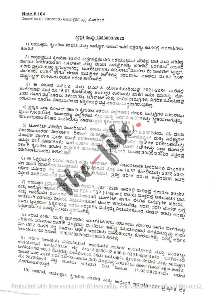 ಅಲ್ಲದೆ ಪರಿಶಿಷ್ಟ ಜಾತಿ ಮತ್ತು ಪರಿಶಿಷ್ಟ ಪಂಗಡ ಕಾರ್ಯಕ್ರಮದಡಿ ಉಚಿತ ವಿತರಿಸಸುವ ಕಾರ್ಯಕ್ರಮದಡಿ 2021-22ರಲ್ಲಿ ಹಂಚಿಕೆಯಾಗಿದ್ದ 16.67 ಕೋಟಿ ರು.ಗಳನ್ನು ಮೇ 2022ರೊಳಗೇ ವೆಚ್ಚ ಮಾಡಬೇಕು ಎಂಬ ಸೂಚನೆಯನ್ನು ಇಲಾಖೆಯು ಪಾಲಿಸಿರಲಿಲ್ಲ. ಹೀಗಾಗಿ ವಿದ್ಯಾರ್ಥಿಗಳಿಗೆ ಟೂಲ್‌ಕಿಟ್‌ ಮತ್ತು ಲೇಖನ ಸಾಮಗ್ರಿಗಳು ನಿಗದಿತ ಅವಧಿಯಲ್ಲಿ ಸರಬರಾಜಾಗದೇ ವಿಳಂಬವಾಗಿತ್ತು ಎಂಬುದು ಟಿಪ್ಪಣಿ ಹಾಳೆಯಿಂದ ತಿಳಿದು ಬಂದಿದೆ.