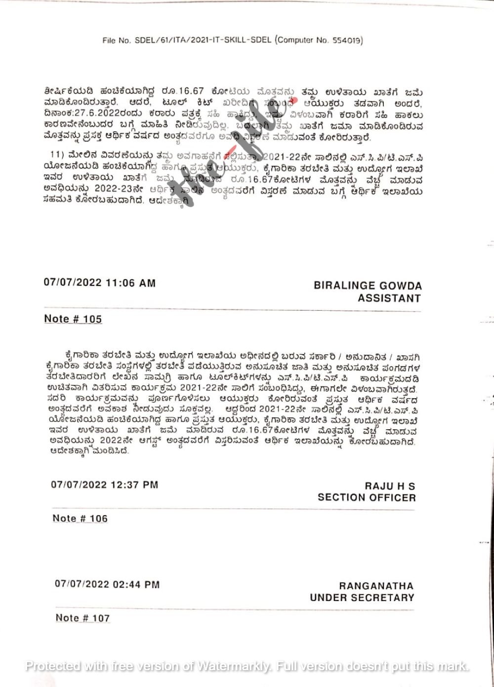 ‘ಕೈಗಾರಿಕೆ ತರಬೇತಿ ಮತ್ತು ಉದ್ಯೋಗ ಇಲಾಖೆಯವರು ಪ್ರಸ್ತಾಪಿತ ಲೆಕ್ಕ ಶೀರ್ಷಿಕೆಯಡಿ ಹಂಚಿಕೆಯಾಗಿದ್ದ 16.67 ಕೋಟಿಯ ಮೊತ್ತವನ್ನು ತಮ್ಮ ಉಳಿತಾಯಖಾತೆಗೆ ಜಮೆ ಮಾಡಿಕೊಂಡಿರುತ್ತಾರೆ. ಆದರೆ ಟೂಲ್‌ ಕಿಟ್‌ ಖರೀದಿಗೆ ಸಂಬಂಧ ಆಯುಕ್ತರು ತಡವಾಗಿ ಅಂದರೆ ದಿನಾಂಕ 27.06.2022ರಂದು ಕರಾರುಪತ್ರಕ್ಕೆ ಸಹಿ ಹಾಕಿದ್ದು, ಇಷ್ಟು ವಿಳಂಬವಾಗಿ ಕರಾರಿಗೆ ಸಹಿ ಹಾಕಲು ಕಾರಣವೇನೆಂಬುದರ ಬಗ್ಗೆ ಮಾಹಿತಿ ನೀಡಿರುವುದಿಲ್ಲ. ಬದಲಾಗಿ ತಮ್ಮ ಖಾತೆಗೆ ಜಮಾ ಮಾಡಿಕೊಂಡಿರುವ ಮೊತ್ತವನ್ನು ಪ್ರಸಕ್ತ ಆರ್ಥಿಕ ವರ್ಷದ ಅಂತ್ಯದವರೆಗೂ ಅವಧಿ ವಿಸ್ತರಣೆಗೆ ಮಾಡುವಂತೆ ಕೋರಿರುತ್ತಾರೆ,’ ಎಂದು ಇಲಾಖೆ ಅಧಿಕಾರಿಗಳು ಟಿಪ್ಪಣಿ ಹಾಳೆಯಲ್ಲಿ ನಮೂದಿಸಿದ್ದಾರೆ.
