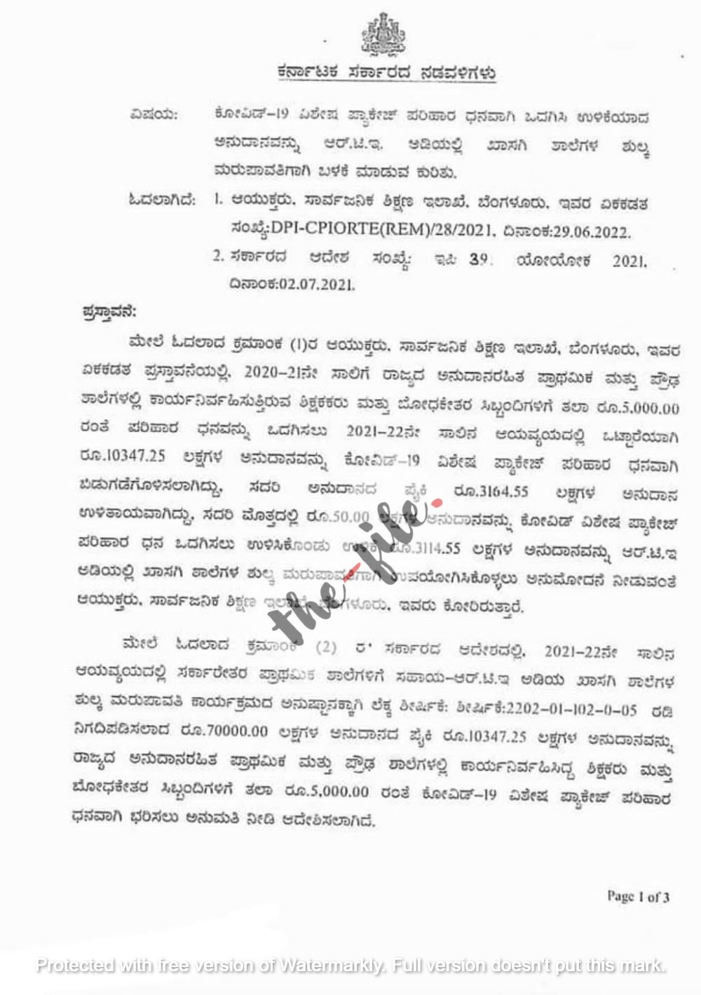 ಕೋವಿಡ್‌ ವಿಶೇಷ ಪ್ಯಾಕೇಜ್‌ ಪರಿಹಾರ ನಿಧಿಗೆ ಬಿಡುಗಡೆಯಾಗಿದ್ದ ಒಟ್ಟು 103.47 ಕೋಟಿ ರು ಪೈಕಿ ಉಳಿಕೆಯಾಗಿರುವ 31.14 ಕೋಟಿ ರು.ಗಳನ್ನು ರಾಜ್ಯ ಸರ್ಕಾರವು ಮಾರ್ಗಪಲ್ಲಟಗೊಳಿಸುವ ಮೂಲಕ ಖಾಸಗಿ ಶಾಲೆಗಳಿಗೆ ಮರುಪಾವತಿಸಲು 2022ರ ಜುಲೈ 13ರಂದು ಆದೇಶ ಹೊರಡಿಸಿದೆ. ಈ ಆದೇಶದ ಪ್ರತಿಯು ‘ದಿ ಫೈಲ್‌’ಗೆ ಲಭ್ಯವಾಗಿದೆ. ಈ ಆದೇಶವನ್ನು ಸಚಿವ ಬಿ ಸಿ ನಾಗೇಶ್‌ ಅವರು ಅನುಮೋದಿಸಿದ್ದಾರೆ ಎಂದು ತಿಳಿದು ಬಂದಿದೆ.