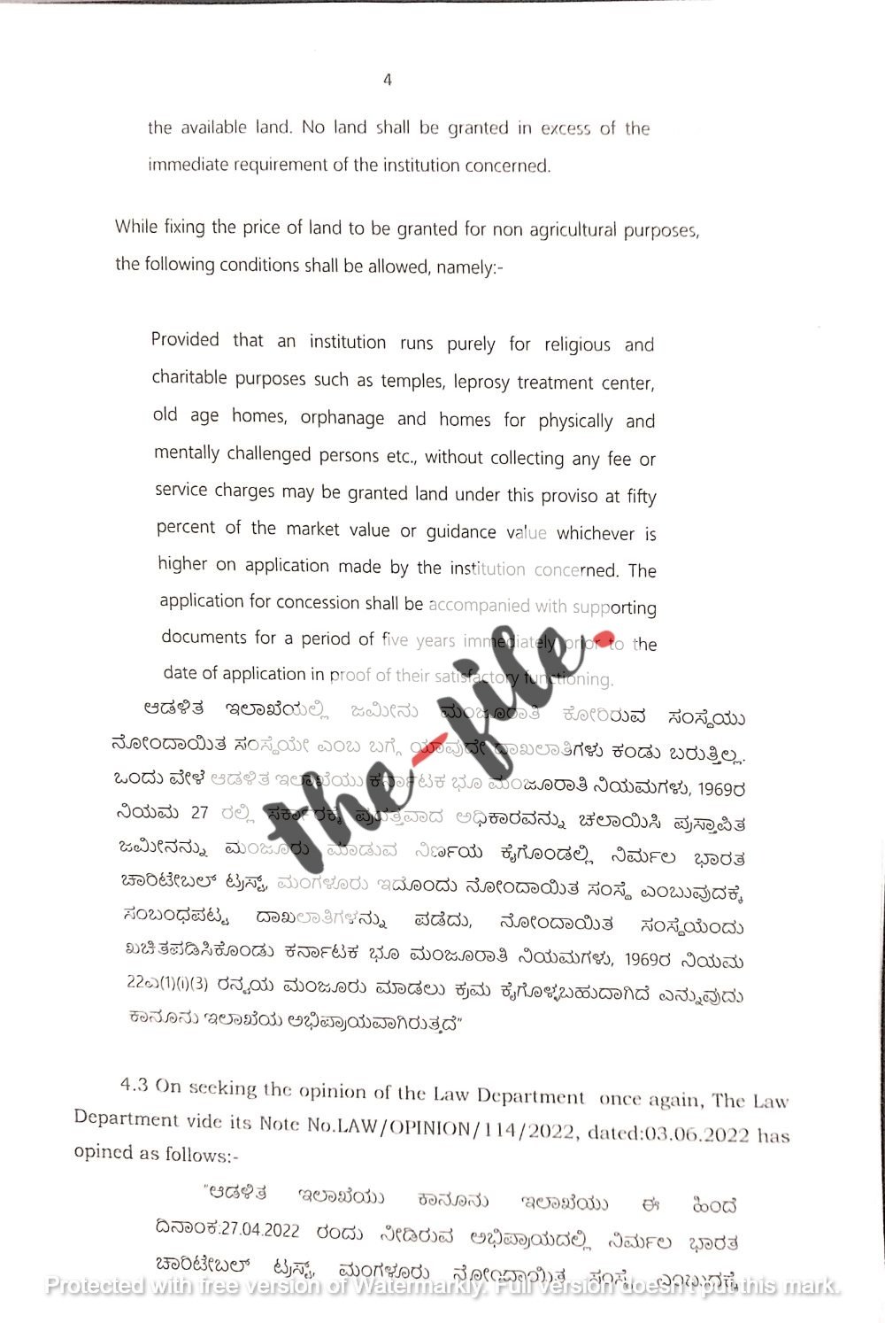 ಅಲ್ಲದೆ ‘ಜಮೀನು ಮಂಜೂರಾತಿ ಕೋರಿರುವ ಸಂಸ್ಥೆಯು ನೋಂದಾಯಿತ ಸಂಸ್ಥೆಯೇ ಎಂಬ ಬಗ್ಗೆ ಯಾವುದೇ ದಾಖಲಾತಿಗಳು ಕಂಡುಬರುತ್ತಿಲ್ಲ. ಒಂದು ವೇಳೆ ಜಮೀನು ಮಂಜೂರು ಮಾಡುವ ನಿರ್ಣಯ ಕೈಗೊಂಡಲ್ಲಿ ನಿರ್ಮಲ ಭಾರತ ಚಾರಿಟಬಲ್ ಟ್ರಸ್ಟ್ ಇದೊಂದು ನೋಂದಾಯಿತ ಸಂಸ್ಥೆ ಎಂಬುದಕ್ಕೆ ಸಂಬಂಧಪಟ್ಟ ದಾಖಲಾತಿಗಳನ್ನು ಪಡೆದು ನೊಂದಾಯಿತ ಸಂಸ್ಥೆಯೆಂದು ಖಚಿತಪಡಿಸಿಕೊಂಡು ಕರ್ನಾಟಕ ಭೂ ಮಂಜೂರಾತಿ ನಿಯಮಗಳು 1969ರ ನಿಯಮ 22ಎ (1)(i)(3) ಅನ್ವಯ ಮಂಜೂರು ಮಾಡಲು ಕ್ರಮಕೈಗೊಳ್ಳಬಹುದು,’ ಎಂದು ಕಾನೂನು ಇಲಾಖೆಯು ಅಭಿಪ್ರಾಯ ನೀಡಿರುವುದು ಸಚಿವ ಸಂಪುಟದ ಪ್ರಸ್ತಾವನೆಯಿಂದ ತಿಳಿದು ಬಂದಿದೆ.