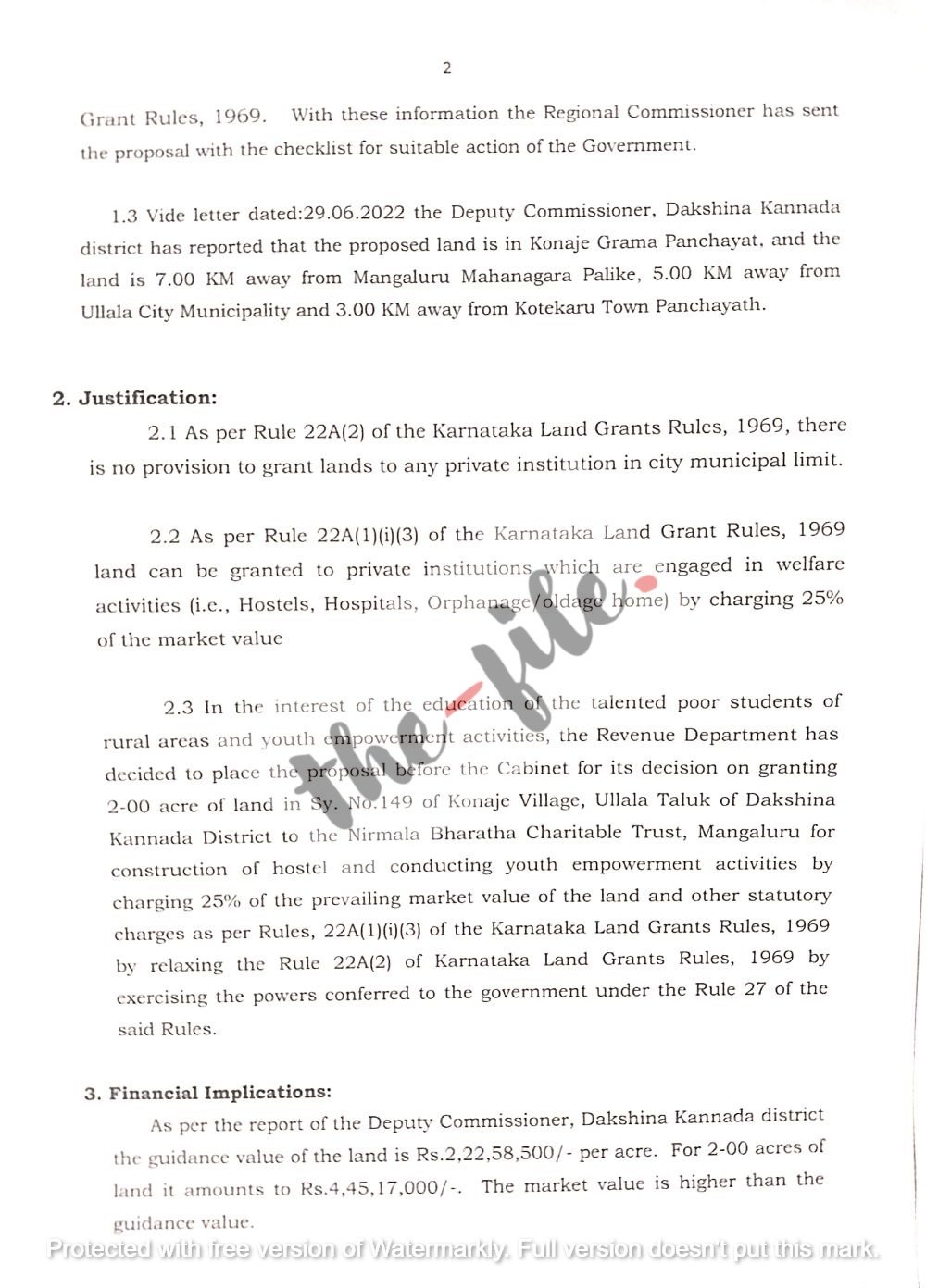 ಕರ್ನಾಟಕ ಭೂ ಮಂಜೂರಾತಿ ನಿಯಿಮಗಳು 1969ರ ನಿಯಮ 27ರಲ್ಲಿ ದಕ್ಷಿಣ ಕನ್ನಡ ಜಿಲ್ಲೆ ಉಳ್ಳಾಲ ತಾಲೂಕು ಕೊಣಾಜೆ ಗ್ರಾಮದ ಸರ್ವೇ ನಂಬರ್ 149ರಲ್ಲಿ ಗ್ರಾಮೀಣ ಪ್ರದೇಶದ ಪ್ರತಿಭಾವಂತ ವಿದ್ಯಾರ್ಥಿಗಳಿಗೆ ವಸತಿನಿಲಯ ಮತ್ತು ಸಬಲೀಕರಣ ಚಟುವಟಿಕೆಗಳಿಗೆ 2.00 ಎಕರೆ ಜಮೀನನ್ನು ನಿರ್ಮಲ ಭಾರತ ಚಾರಿಟಬಲ್ ಟ್ರಸ್ಟ್ನ ಅಧ್ಯಕ್ಷರ ಹೆಸರಿಗೆ ಭೂ ಮಂಜೂರಾತಿ ನಿಯಿಮಗಳು 1969ರ ನಿಯಮ 22ಎ (1)(i)(3) ಅನ್ವಯ ಜಮೀನಿನ ಮಾರುಕಟ್ಟೆ ಮೌಲ್ಯದ ಶೇ.25ರಷ್ಟು ಮತ್ತು ಇನ್ನಿತರೆ ಶಾಸನಬದ್ಧ ಶುಲ್ಕಗಳನ್ನು ವಿಧಿಸಿ ಮಂಜೂರು ಮಾಡಬೇಕು,’ ಎಂದು ಕಂದಾಯ ಇಲಾಖೆಯು ಪ್ರಸ್ತಾವನೆ ಸಲ್ಲಿಸಿದೆ.