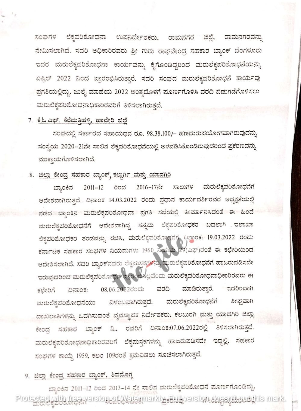 ಹಾಗೆಯೇ ಧಾರವಾಡ ಜಿಲ್ಲೆಯ ಅಳಗವಾಡಿಯ ಪ್ರಾಥಮಿಕ ಕೃಷಿ ಪತ್ತಿನ ಸಹಕಾರ ಸಂಘ, ಮೈಸೂರಿನ ಕೇಂದ್ರ ಶಿಕ್ಷಣ ಸಚಿವಾಲಯದ ನೌಕರರ ಸಹಕಾರ ಸಂಘ, ಯಲಬುರ್ಗಾ ಪಿಕಾರ್ಡ್ ಬ್ಯಾಂಕ್, ಶ್ರೀರಂಗಪಟ್ಟಣದ ದರಸಗುಪ್ಪೆ ಕೃಷಿ ಪತ್ತಿನ ಸಹಕಾರ ಸಂಘ, ಸಿದ್ದಾಪುರ ವ್ಯವಸಾಯ ಸೇವಾ ಸಹಕಾರಿ ಸಂಘ, ಸಹ್ಯಾದ್ರಿ ಗಿರಿಜನ ದೊಡ್ಡಪ್ರಮಾಣದ ವಿವಿದೋದ್ದೇಶಗಳ ಸಹಕಾರ ಸಂಘ, ಚಿಕ್ಕೋಡಿಯ ಕರ್ನಾಟಕ ವಿದ್ಯುತ್ ಮಂಡಳಿ ನೌಕರರ ಪತ್ತಿನ ಸಹಕಾರ ಸಂಘದಲ್ಲಿ ಮರುಲೆಕ್ಕಪರಿಶೋಧನೆ ಪ್ರಗತಿಯಲ್ಲಿದೆ ಎಂದು ಗೊತ್ತಾಗಿದೆ.