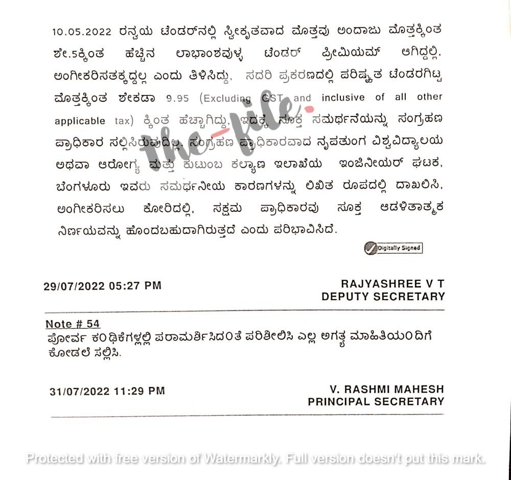 ಹಾಗೆಯೇ ಟೆಂಡರ್‌ನಲ್ಲಿ ಸ್ವೀಕೃತವಾದ ಮೊತ್ತವು ಅಂದಾಜು ಮೊತ್ತಕ್ಕಿಂತ ಶೇ.5ಕ್ಕಿಂತ ಹೆಚ್ಚಿನ ಲಾಭಾಂಶವುಳ್ಳ ಟೆಂಡರ್‌ ಪ್ರೀಮಿಯಂ ಅಗಿದ್ದಲ್ಲಿ ಅಂಗೀಕರಿಸಬಾರದು ಎಂದು 2022ರ ಮೇ 10ರಂದೇ ಆರ್ಥಿಕ ಇಲಾಖೆಯು ಸೂಚಿಸಿದೆ. ಆದರೆ ಈ ಪ್ರಕರಣದಲ್ಲಿ ಪರಿಷ್ಕೃತ ಟೆಂಡರ್‌ಗಿಟ್ಟ ಮೊತ್ತಕ್ಕಿಂತ ಶೇ. 9.95ಕ್ಕಿಂತ ಹೆಚ್ಚಾಗಿದೆ. ಆದರೂ ಇದಕ್ಕೆ ಸಕ್ಷಮ ಪ್ರಾಧಿಕಾರವು ಸೂಕ್ತ ಸಮರ್ಥನೆಯನ್ನು ಸಲ್ಲಿಸಿಲ್ಲ ಎಂದು ತಿಳಿದು ಬಂದಿದೆ.