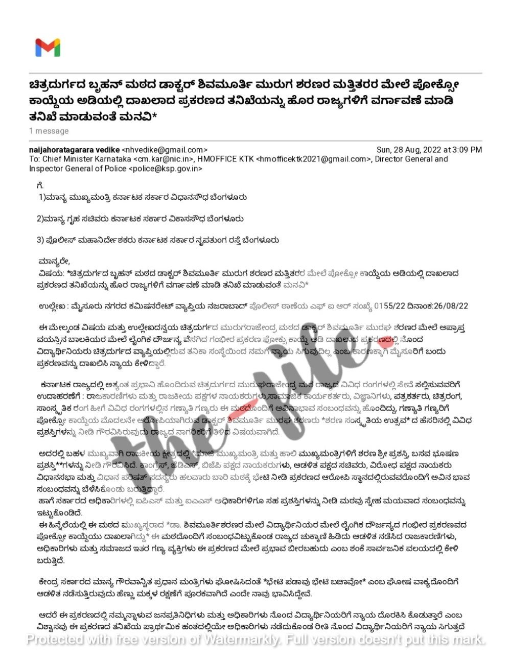 ಬೆಂಗಳೂರು; ಚಿತ್ರದುರ್ಗದ ಮುರುಘಾ ಮಠದ ಶಿವಮೂರ್ತಿ ಶರಣರ ವಿರುದ್ಧ ದಾಖಲಾಗಿರುವ ಪೋಕ್ಸೋ ಪ್ರಕರಣದ ತನಿಖೆಯನ್ನು ಹೊರರಾಜ್ಯಕ್ಕೆ ವರ್ಗಾಯಿಸಬೇಕು ಎಂದು ಸಾಮಾಜಿಕ ಹೋರಾಟಗಾರರು ಮುಖ್ಯಮಂತ್ರಿ, ಗೃಹ ಸಚಿವ ಮತ್ತು ಪೊಲೀಸ್ ಮಹಾನಿರ್ದೇಶಕರಿಗೆ ಮನವಿ ಸಲ್ಲಿಸಿದ್ದಾರೆ.