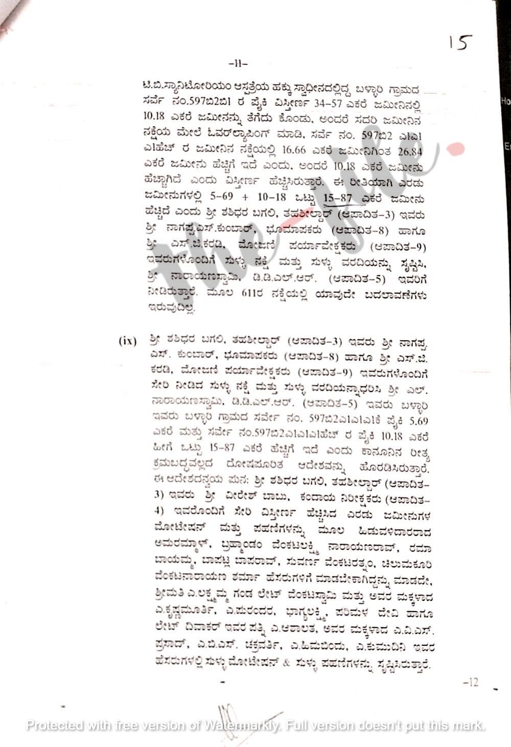 ಅಂದರೆ ಈ ಜಮೀನಿನ ನಕ್ಷೆಯ ಮೇಲೆ ಓವರ್ಲ್ಯಾಪಿಂಗ್ ಮಾಡಿ ಸರ್ವೆ ನಂಬರ್ 597ಬಿ2ಎ1ಎ1ಎ1ಹೆಚ್ರ ಜಮೀನಿನ ನಕ್ಷೆಯಲ್ಲಿ 16..6 ಎಕರೆ ಜಮಿನಿಗಿಂತ 24.84 ಎಕರೆ ಜಮೀನು ಹೆಚ್ಚಿಗೆ ಇದೆ ಎಂದು ದಾಖಲೆ ಸೃಷ್ಟಿಸಿ 10.18 ಎಕರೆ ಜಮೀನು ಹೆಚ್ಚಾಗಿದೆ ಎಂದು ವಿಸ್ತೀರ್ಣ ಹೆಚ್ಚಿಸಲಾಗಿತ್ತು. ಈ ರೀತಿಯಾಗಿ ಒಟ್ಟು 15.87 (5-69+10-18) ಜಮೀನು ಹೆಚ್ಚಿದೆ ಎಂದು ತಹಶೀಲ್ದಾರ್ ಶಶಿಧರ ಬಗಲಿ ಸೇರಿದಂತೆ ಇತರೆ ಅಧಿಕಾರಿಗಳು ಸುಳ್ಳು ನಕ್ಷೆ, ಸುಳ್ಳು ವರದಿ ಸೃಷ್ಟಿಸಿದ್ದರು. ಇದೇ ವರದಿಯನ್ನಾಧರಿಸಿ ಡಿಡಿಎಲ್ಆರ್ ನಾರಾಯಣಸ್ವಾಮಿ ಎಂಬುವರು ಕಾನೂನು ರೀತಿ ಕ್ರಮಬದ್ಧವಲ್ಲದ ದೋಷಪೂರಿತ ಆದೇಶ ಹೊರಡಿಸಿದ್ದರು.