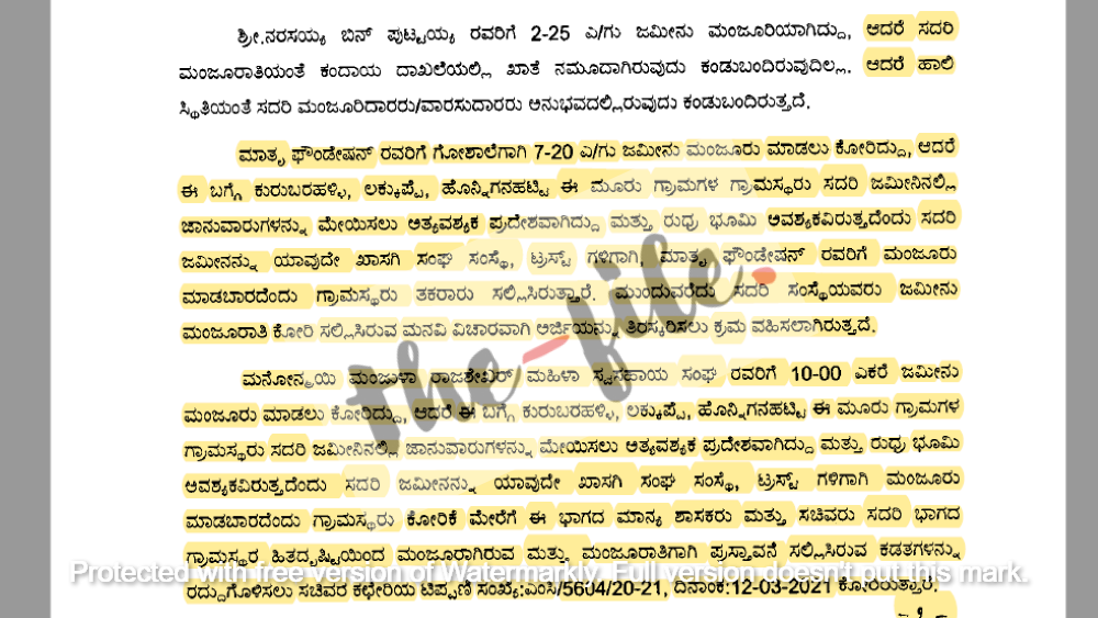 ನಾಡಕಚೇರಿ, ತಹಶೀಲ್ದಾರ್‌ ಸೇರಿದಂತೆ ಕಂದಾಯ ಇಲಾಖೆಯು ಜನಸೇವಾ ಟ್ರಸ್ಟ್‌ಗೆ ಜಮೀನು ಮಂಜೂರು ಮಾಡಲು ತೋರಿಸಿದ್ದ ಅತ್ಯುತ್ಸಾಹವನ್ನು ಮಾತೃ ಫೌಂಡೇಷನ್‌ ದಾಖಲೆ ಸಮೇತ ಸರ್ಕಾರದ ಗಮನಕ್ಕೆ ತಂದಿದ್ದರು. ‘ಕುರುಬರಹಳ್ಳಿಯಲ್ಲಿ ರೈತರು ಮನೆಯಲ್ಲಿಯೇ ಜಾನುವಾರುಗಳನ್ನು ಕಟ್ಟಿಹಾಕಿ ಮೇವು ನೀಡುತ್ತಿದ್ದಾರೆ. ಹೀಗಾಗಿ ಗೋಮಾಳ ಜಮೀನು ಮಂಜೂರು ಮಾಡಲು ಸಾಧ್ಯವಿಲ್ಲ ಎಂದು ಮಾತೃ ಫೌಂಡೇಷನ್‌ಗೆ ಹಿಂಬರಹ ನೀಡಿದ್ದಾರೆ. ಆದರೆ ಈ ನಿಯಮ ಜನಸೇವಾ ಟ್ರಸ್ಟ್‌ಗೆ ಅನ್ವಯವಾಗುವುದಿಲ್ಲವೇ,? ಎಂದು ಫೌಂಡೇಷನ್‌ ಸರ್ಕಾರಕ್ಕೆ ಪತ್ರವನ್ನೂ ಬರೆದಿತ್ತು. ಇದು ಕಂದಾಯ ಸಚಿವ ಆರ್‌ ಅಶೋಕ್‌ ಅವರ ಗಮನದಲ್ಲೂ ಇತ್ತು ಎಂದು ಗೊತ್ತಾಗಿದೆ.