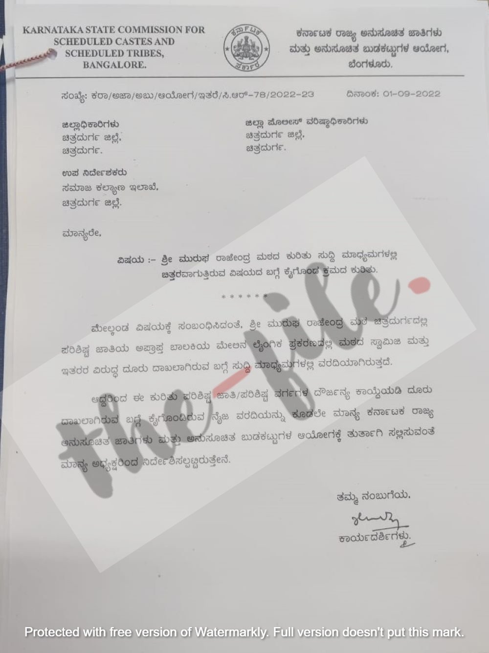 ‘ಶ್ರೀ ಮುರುಘ ರಾಜೇಂದ್ರ ಮಠದಲ್ಲಿ ಪರಿಶಿಷ್ಟ ಜಾತಿಯ ಅಪ್ತಾಪ್ತ ಬಾಲಕಿಯ ಮೇಲಿನ ಲೈಂಗಿಕ ಪ್ರಕರಣದಲ್ಲಿ ಮಠದ ಸ್ವಾಮೀಜಿ ಮತ್ತುಇ ಇತರರ ವಿರುದ್ಧ ದೂರು ದಾಖಳಾಗಿರುವಬಗ್ಗೆ ಸುದ್ದಿ ಮಾಧ್ಯಮಗಳಲ್ಲಿ ವರದಿಯಾಗಿರುತ್ತದೆ. ಆದ್ದರಿಂದ ಈ ಕುರಿತು ಪರಿಶಿಷ್ಟ ಜಾತಿ, ಪರಿಶಿಷ್ಟ ವರ್ಗಗಳ ದೌರ್ಜನ್ಯ ಕಾಯ್ದೆಯಡಿ ದೂರು ದಾಖಲಾಗಿರುವ ಬಗ್ಗೆ ಕೈಗೊಂಡಿರುವ ನೈಜ ವರದಿಯನ್ನುಕೂಡಲೇ ಕರ್ನಾಟಕ ರಾಜ್ಯ ಅನುಸೂಚಿತ ಜಾತಿಗಳು ಮತ್ತು ಅನಸೂಚಿತ ಬುಡಕಟ್ಟುಗಳ ಆಯೋಗಕ್ಕೆ ತುರ್ತಾಗಿ ಸಲ್ಲಿಸಬೇಕು,’ ಎಂದು ಕರ್ನಾಟಕ ರಾಜ್ಯ ಅನುಸೂಚಿತ ಜಾತಿಗಳು ಮತ್ತು ಅನಸೂಚಿತ ಬುಡಕಟ್ಟುಗಳ ಆಯೋಗವು 2022ರ ಸೆ.1ರಂದು ನಿರ್ದೇಶಿಸಿದೆ.
