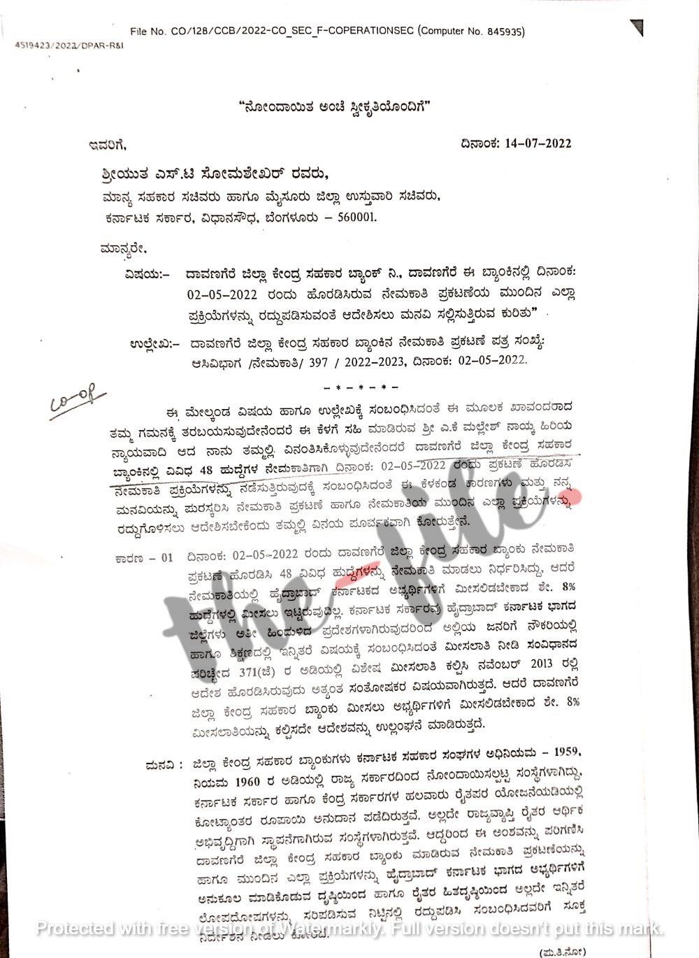 ದಾವಣಗೆರೆ ಜಿಲ್ಲಾ ಕೇಂದ್ರ ಸಹಕಾರ ಬ್ಯಾಂಕ್ ನೇಮಕಾತಿಗೆ ಹೊರಡಿಸಿರುವ ಅಧಿಸೂಚನೆಯಲ್ಲಿ ಹೈದ್ರಾಬಾದ್ ಕರ್ನಾಟಕ ಅಭ್ಯರ್ಥಿಗಳಿಗೆ ಅನ್ಯಾಯವಾಗಿದೆ ಎಂದು ದೂರಿರುವ ಮಲ್ಲೇಶ್ನಾಯ್ಕ್ ಅವರು 48 ವಿವಿಧ ಹುದ್ದೆಗಳ ನೇಮಕಾತಿ ಸಂಬಂಧ ಹೈ-ಕ ಭಾಗದ ಅಭ್ಯರ್ಥಿಗಳಿಗೆ ಶೇ. 8 ರಷ್ಟು ಹುದ್ದೆಗಳಲ್ಲಿ ಮೀಸಲಿಡದೇ ವಂಚನೆ ಮಾಡಲಾಗಿದೆ,’ ಎಂದು ದೂರಿದ್ದಾರೆ.
