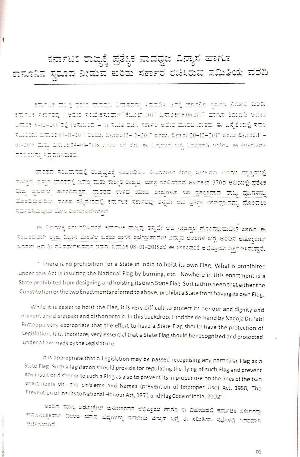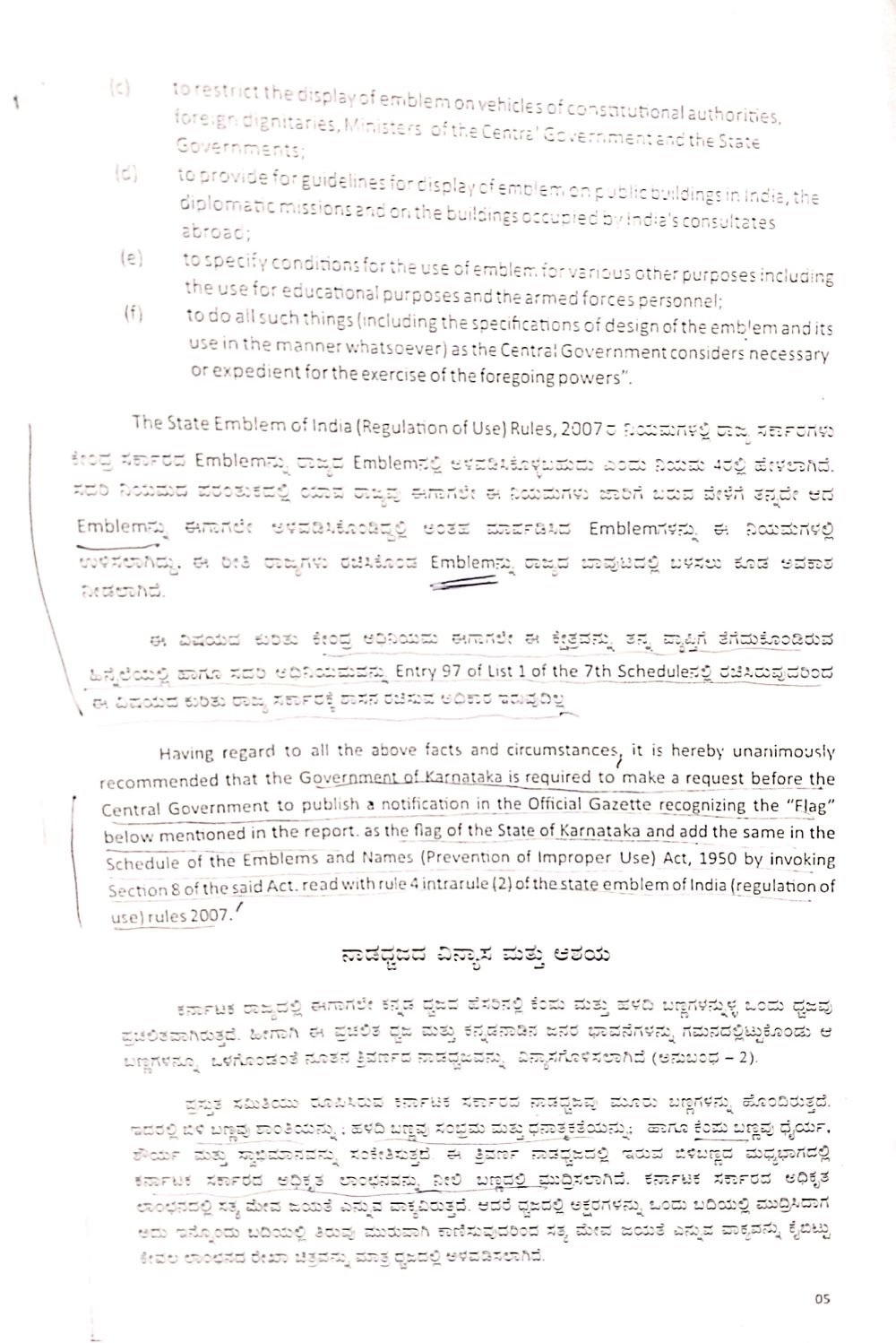 ‘ಕರ್ನಾಟಕ ಸರ್ಕಾರ ನಾಡಧ್ವಜವನ್ನು ರೂಪಿಸಿ ಅದಕ್ಕೆ ಕಾನೂನು ಸ್ವರೂಪ ನೀಡುವ ಸಂಬಂಧ ಮೇಲೆ ಹೇಳಿದ ಈ ಎಲ್ಲ ವಿಷಯಗಳ ವ್ಯಾಪ್ತಿ ಮತ್ತು ಚರ್ಚೆಯ ಹಿನ್ನೆಲೆಯಲ್ಲಿ ಕರ್ನಾಟಕ ಸರ್ಕಾರವು ತನ್ನ ಉದ್ದೇಶಿತ ಬಾವುಟಕ್ಕೆ ಕೇಂದ್ರ ಸರ್ಕಾರದ ಅನುಮೋದನೆ ಪಡೆಯಲು ಸಚಿವ ಸಂಪುಟದಲ್ಲಿ ನಿರ್ಣಯಿಸಿ ಆ ನಂತರ ಕೇಂದ್ರ ಸರ್ಕಾರದೊಂದಿಗೆ ಪತ್ರ ವ್ಯವಹಾರ ಮಾಡುವುದು ಸೂಕ್ತ,’ ಎಂದು ಸಮಿತಿಯು ವರದಿಯಲ್ಲಿ ಅಭಿಪ್ರಾಯಿಸಿತ್ತು.