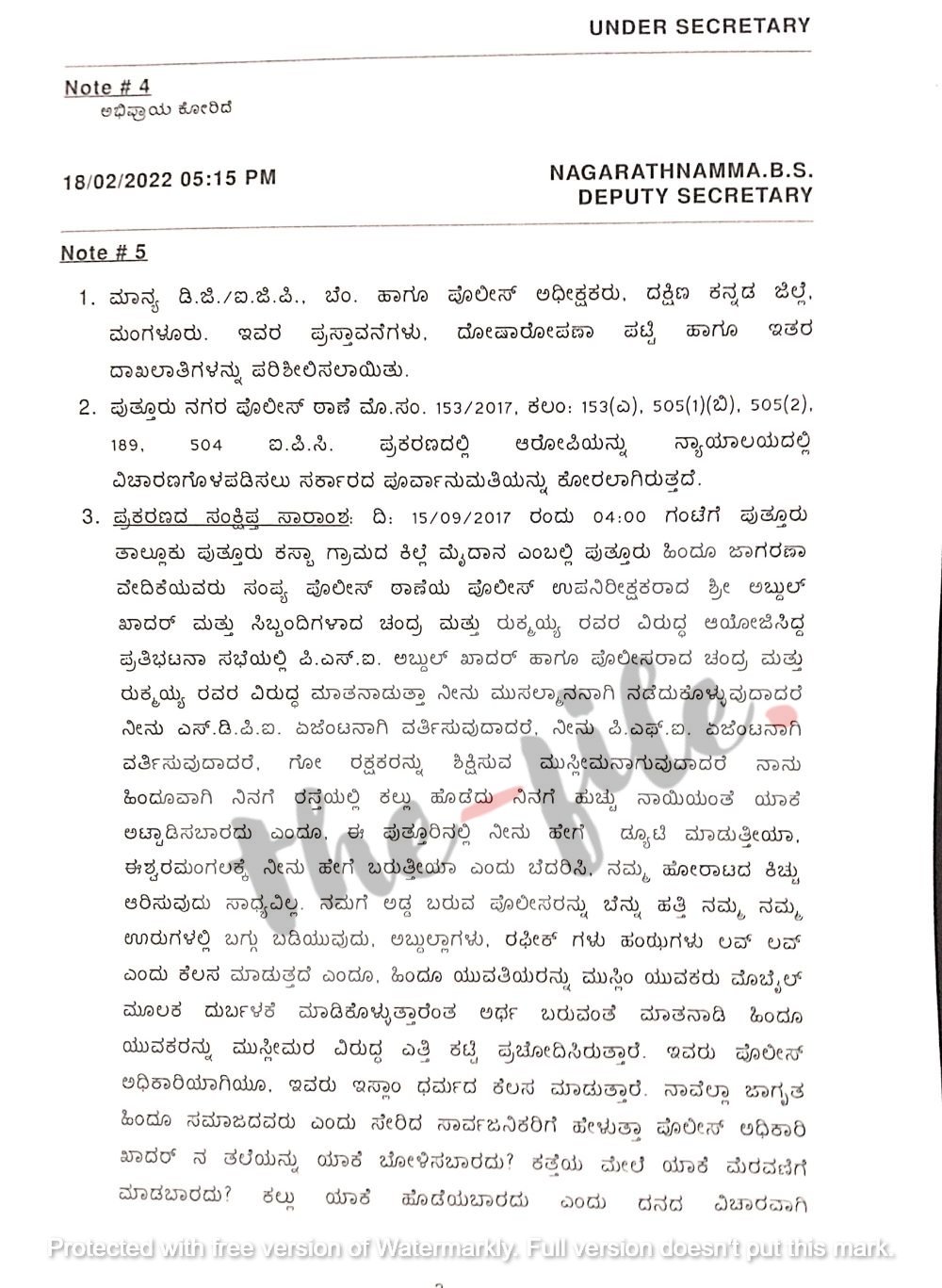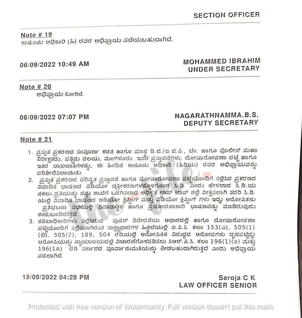 ಪ್ರಸ್ತುತ ಪ್ರಕರಣದ ಸಂಪೂರ್ಣ ಕಡತ, ಮಂಗಳೂರು ಪಶ್ಚಿಮ ವಲಯದ ಡಿಜಿ/ಐಜಿಪಿ, ಅವರು ಸಲ್ಲಿಸಿದ್ದ ಪ್ರಸ್ತಾವನೆಗಳು, ದೋಷಾರೋಪಣೆ ಪಟ್ಟಿ ಹಾಗೂ ಇತರ ದಾಖಲಾತಿಗಳನ್ನು ಇಲಾಖೆಯು ಪರಿಶೀಲಿಸಿದೆ. ಪ್ರಕರಣದ ಪರಿಷ್ಕೃತ ಪ್ರಸ್ತಾವನೆ, ದೋಷಾರೋಪಣೆ ಪಟ್ಟಿಯೊಂದಿಗೆ ವಿವಾದಿತ ಭಾಷಣದ ಆಡಿಯೋ, ವಿಡಿಯೋ ಚಿತ್ರೀಕರಣಗಳನ್ನೊಳಗೊಂಡ ಸಿ. ಡಿ. ಯನ್ನು ಪರಿಶೀಲಿಸಲಾಯಿತು.