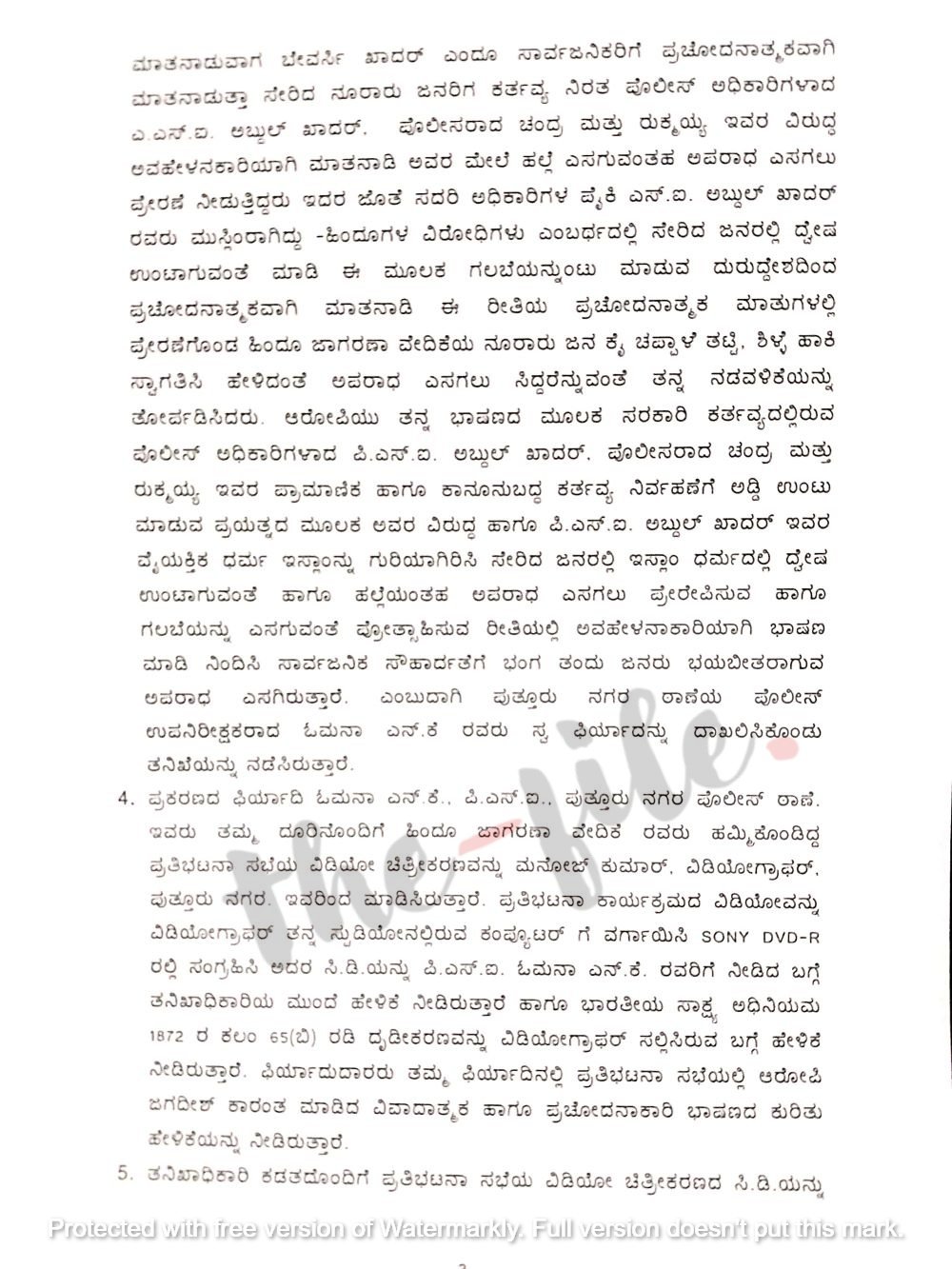 ಈ ಮೂಲಕ ಅವರ ವಿರುದ್ಧ ಹಾಗೂ ಪಿಎಸ್ಐ ಅಬ್ದುಲ್ ಖಾದರ್ ಅವರ ವೈಯಕ್ತಿಕ ಧರ್ಮ ಇಸ್ಲಾಂನ್ನು ಗುರಿಯಾಗಿಸಿ ಸೇರಿದ ಜನರಲ್ಲಿ ಇಸ್ಲಾಂ ಧರ್ಮದಲ್ಲಿ ದ್ವೇಷ ಉಂಟಾಗುವಂತೆ ಹಾಗೂ ಹಲ್ಲೆಯಂತಹ ಅಪರಾಧ ಎಸಗಲು ಪ್ರೇರೇಪಿಸುವ , ಗಲಭೆ ಎಸಗುವಂತಹ ಪ್ರೋತ್ಸಾಹಿಸುವ ರೀತಿಯಲ್ಲಿ ಅವಹೇಳನಕಾರಿಯಾಗಿ ಭಾಷಣ ಮಾಡಿ ನಿಂದಿಸಿ ಸಾರ್ವಜನಿಕ ಸೌಹಾರ್ದತೆಗೆ ಭಂಗ ತಂದು ಜನರು ಭಯಭೀತರಾಗುವ ಅಪರಾಧ ಎಸಗಿರುತ್ತಾರೆ ಎಂಬ ಸುದೀರ್ಘವಾಗಿ ಟಿಪ್ಪಣಿ ಹಾಳೆಯಲ್ಲಿ ವಿವರಿಸಲಾಗಿದೆ.