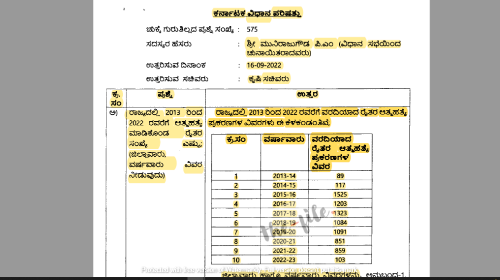 2013-14ರಲ್ಲಿ 89, 2014-15ರಲ್ಲಿ 117, 2015-16ರಲ್ಲಿ 1,525, 2016-17ರಲ್ಲಿ 1,203, 2017-18ರಲ್ಲಿ 1,232, 2018-19ರಲ್ಲಿ 1,084, 2019-20ರಲ್ಲಿ 1,091, 2020-21ರಲ್ಲಿ 851, 2021-22ರಲ್ಲಿ 859, 2022-23ರಲ್ಲಿ 103 ರೈತರು ಆತ್ಮಹತ್ಯೆ ಮಾಡಿಕೊಂಡ ಬಗ್ಗೆ ವರದಿಯಾಗಿದೆ.
