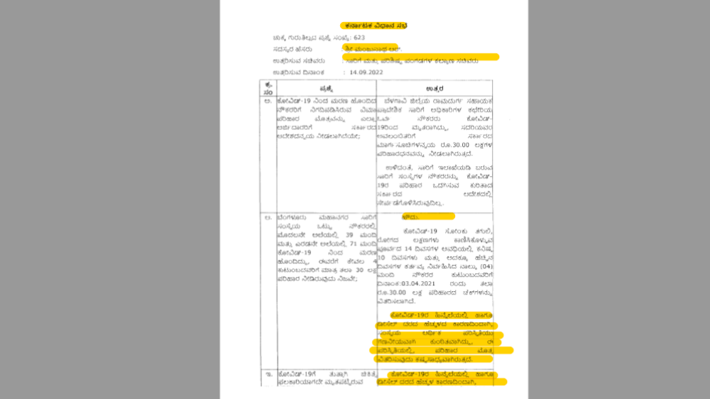 ಬೆಂಗಳೂರು ಮಹಾನಗರ ಸಾರಿಗೆ ಸಂಸ್ಥೆಯ ಒಟ್ಟು ನೌಕರರಲ್ಲಿ ಮೊದಲ ಅಲೆಯಲ್ಲಿ 39, ಎರಡನೇ ಅಲೆಯಲ್ಲಿ 71 ಮಂದಿ ಕೋವಿಡ್ ಸಾಂಕ್ರಾಮಿಕಕ್ಕೆ ತುತ್ತಾಗಿ ಮರಣ ಹೊಂದಿದ್ದರು. ಆದರೆ ಇದುವರೆಗೆ ಕೇವಲ 4 ಕುಟುಂಬದವರಿಗೆ ಮಾತ್ರ ತಲಾ 30 ಲಕ್ಷ ರು.ಗಳನ್ನು ಮಾತ್ರ ಪರಿಹಾರ ಧನ ನೀಡಿರುವುದು ಉತ್ತರದಿಂದ ತಿಳಿದು ಬಂದಿದೆ.