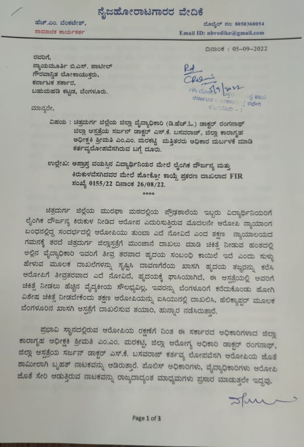 ಲೈಂಗಿಕ ದೌರ್ಜನ್ಯ ಎಸಗಿರುವ ಆರೋಪದಿಂದ ಮುರುಘಾ ಶರಣರನ್ನು ರಕ್ಷಿಸಲು ನೆರವಾಗಿ ಕರ್ತವ್ಯಲೋಪ ಎಸಗಿದ್ದಾರೆ ಎಂಬ ಆರೋಪಿಸಿರುವ ನೈಜ ಹೋರಾಟಗಾರರ ವೇದಿಕೆಯು ಜಿಲ್ಲಾ ಕಾರಾಗೃಹ ಅಧೀಕ್ಷಕಿ ಎಂ ಎಂ ಮರಕಟ್ಟಿ, ಜಿಲ್ಲಾ ಆರೋಗ್ಯ ಅಧಿಕಾರಿ ಡಾ ರಂಗನಾಥ್, ಜಿಲ್ಲಾ ಆಸ್ಪತ್ರೆಯ ಸರ್ಜನ್ ಡಾ ಬಸವರಾಜ್ ಎಂಬುವರ ವಿರುದ್ಧ ಲೋಕಾಯುಕ್ತ ಬಿ ಎಸ್ ಪಾಟೀಲ್ ಅವರಿಗೆ ದೂರು ಸಲ್ಲಿಸಿದೆ. ಈ ದೂರಿನ ಪ್ರತಿಯು ‘ದಿ ಫೈಲ್’ಗೆ ಲಭ್ಯವಾಗಿದೆ.