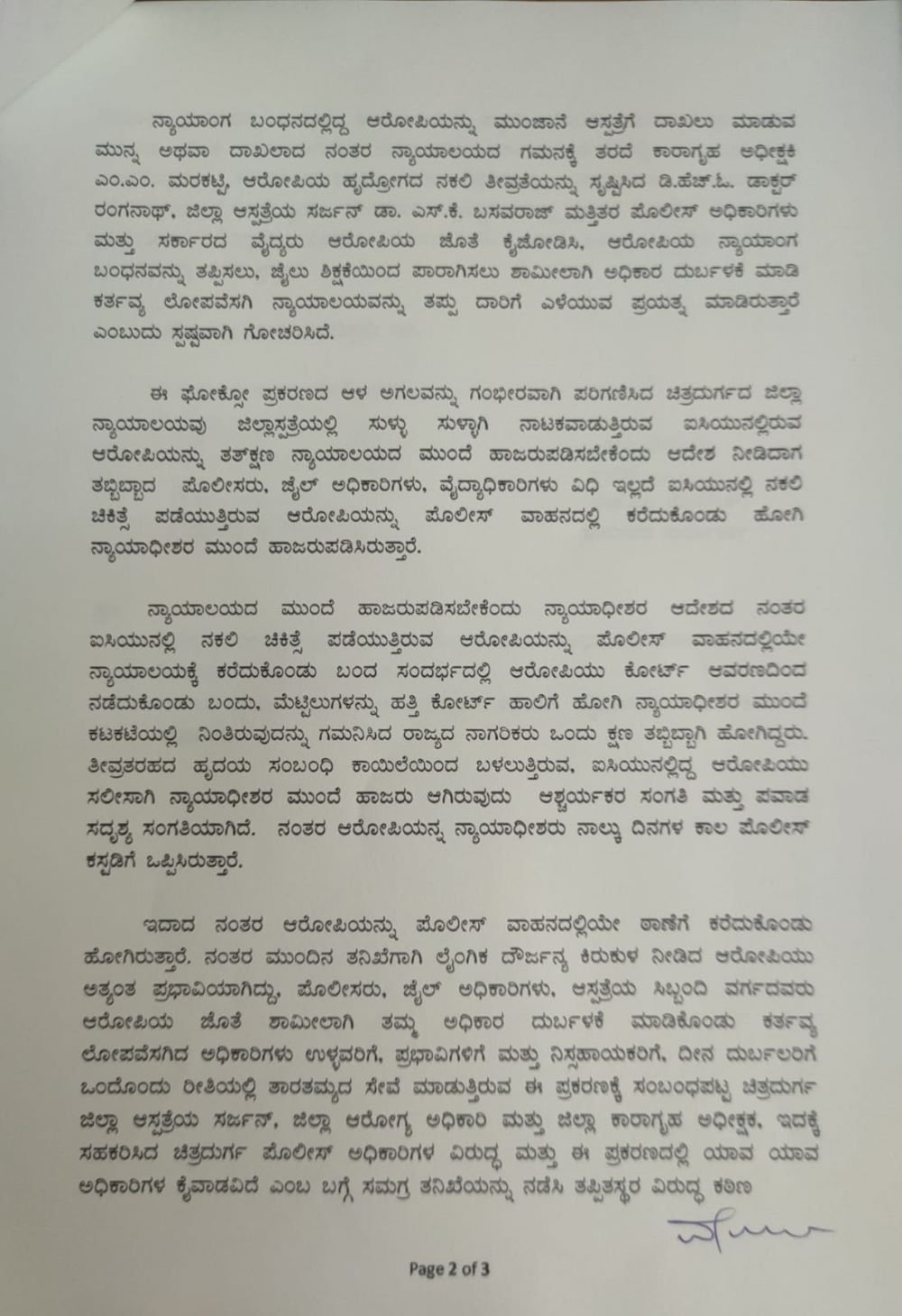 ‘ದಾವಣಗೆರೆಯ ಖಾಸಗಿ ಹೃದಯ ತಜ್ಞರನ್ನು ಕರೆಸಿ ಆರೋಪಿಗೆ ತೀವ್ರತರವಾದ ಎದೆನೋವಿದೆ, ಹೃದಯಕ್ಕೆ ಘಾಸಿಯಾಗಿದೆ ಈ ಆಸ್ಪತ್ರೆಯ್ಲಲಿ ಅವರಿಗೆ ಚಿಕಿತ್ಸೆ ನೀಡಲು ಹೆಚ್ಚಿನ ವೈದ್ಯಕೀಯ ಸೌಲಭ್ಯವಿಲ್ಲ, ಇವರನ್ನು ಬೆಂಗಳೂರಿಗೆ ಕರೆದುಕೊಂಡು ಹೋಗಿ ವಿಶೇಷ ಚಿಕಿತ್ಸೆ ನೀಡಬೇಕೆಂದು ತಕ್ಷಣವೇ ಆರೋಪಿಯನ್ನು ಐಸಿಯುನಲ್ಲಿ ದಾಖಲಿಸಿ ಹೆಲಿಕಾಪ್ಟರ್ ಮೂಲಕ ಬೆಂಗಳೂರಿನ ಖಾಸಗಿ ಆಸ್ಪತ್ರೆಗೆ ದಾಖಲಿಸಲು ಹುನ್ನಾರ ನಡೆಸಿದ್ದಾರೆ,’ ಎಂದು ವೇದಿಕೆಯು ದೂರಿನಲ್ಲಿ ಆಪಾದಿಸಿದೆ.