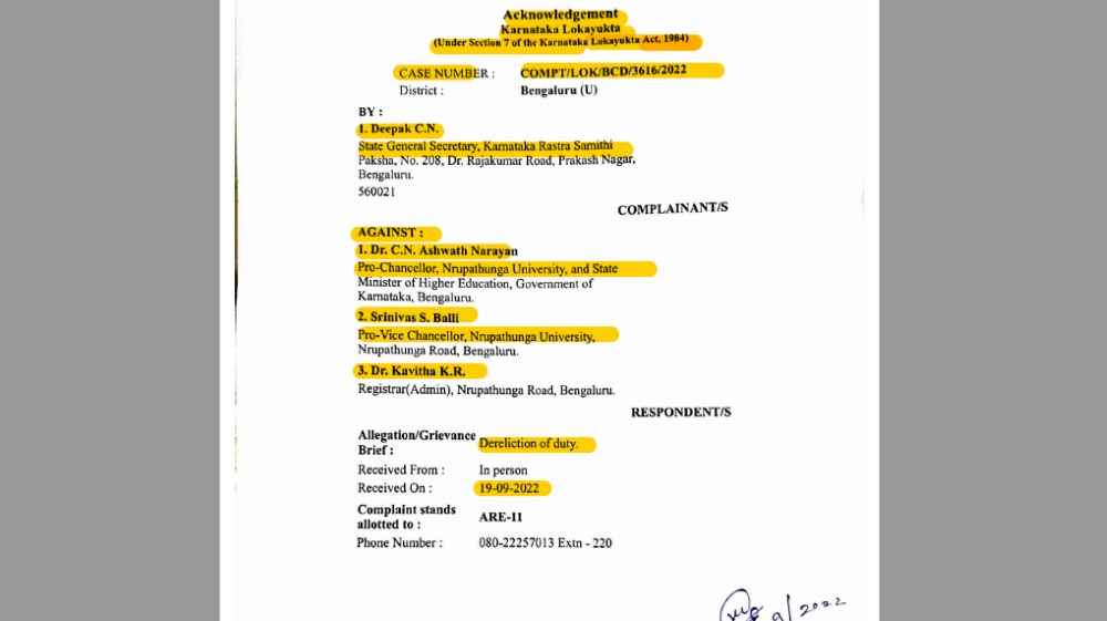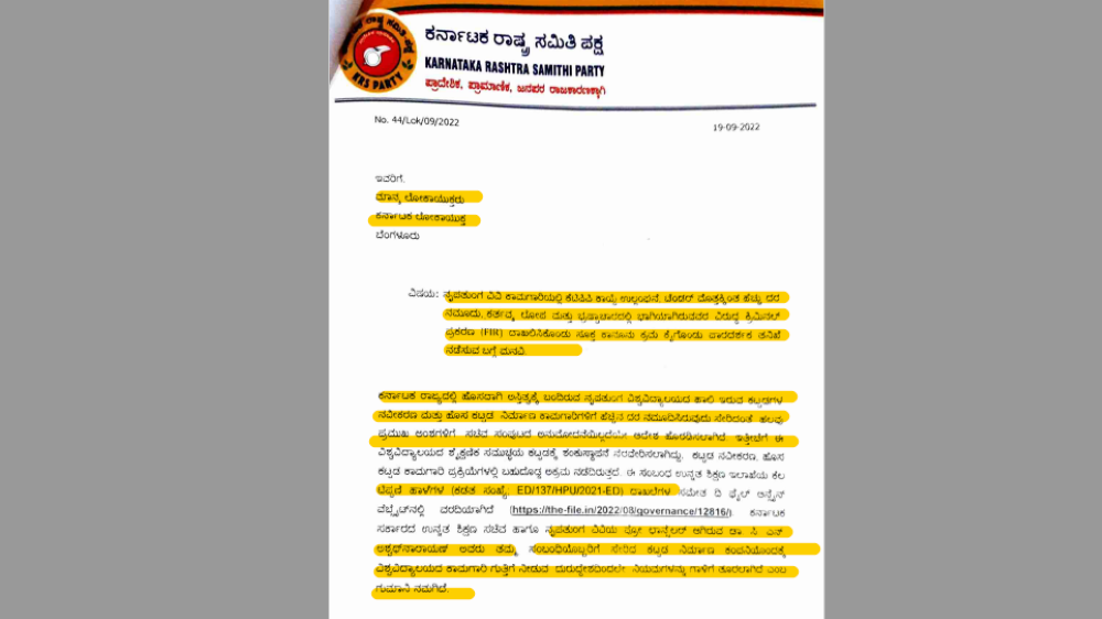ಕೆಟಿಪಿಪಿ ಕಾಯ್ದೆ ಉಲ್ಲಂಘನೆ; ಸಚಿವ, ಕುಲಪತಿ, ರಿಜಿಸ್ಟ್ರಾರ್‌ ವಿರುದ್ಧ ಕೆಆರ್‌ಎಸ್‌ ಪಕ್ಷದಿಂದ ಲೋಕಾಯುಕ್ತಕ್ಕೆ ದೂರು