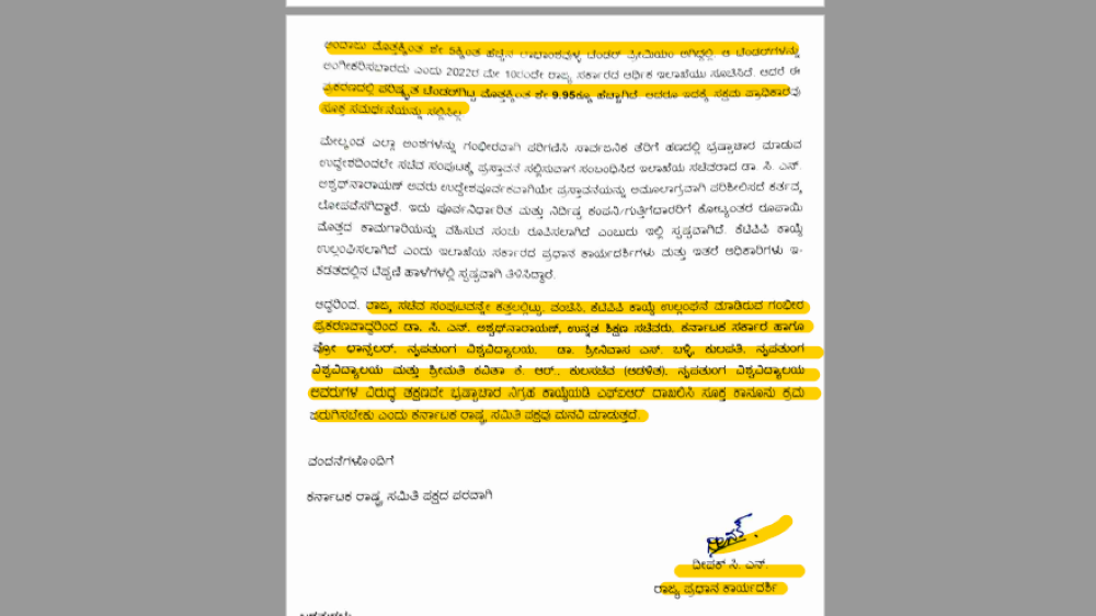 ‘ಈ ಅಂಶಗಳನ್ನು ಗಂಭೀರವಾಗಿ ಪರಿಗಣಿಸಿ ಸಾರ್ವಜನಿಕವಾಗಿ ತೆರಿಗೆ ಹಣದಲ್ಲಿ ಭ್ರಷ್ಟಾಚಾರ ಮಾಡುವ ಉದ್ದೇಶದಿಂದಲೇ ಸಚಿವ ಸಂಪುಟಕ್ಕೆ ಪ್ರಸ್ತಾವನೆ ಸಲ್ಲಿಸುವಾಗ ಸಂಬಂಧಿಸಿದ ಇಲಾಖೆ ಸಚಿವ ಡಾ ಸಿ ಎನ್‌ ಅಶ್ವಥ್‌ನಾರಾಯಣ್‌ ಅವರು ಉದ್ದೇಶಪೂರ್ವಕವಾಗಿಯೇ ಪ್ರಸ್ತಾವನೆಯನ್ನು ಅಮೂಲಾಗ್ರವಾಗಿ ಪರಿಶೀಲಿಸದೇ ಕರ್ತವ್ಯಲೋಪೆಸಗಿದ್ದಾರೆ. ಇದು ಪೂರ್ವನಿರ್ಧರಿತ ಮತ್ತು ನಿರ್ದಿಷ್ಟ ಕಂಪನಿ/ಗುತ್ತಿಗೆದಾರರಿಗೆ ಕೋಟ್ಯಂತರ ರುಪಾಯಿ ಮೊತ್ತದ ಕಾಮಗಾರಿಯನ್ನು ವಹಿಸುವ ಸಂಚು ರೂಪಿಸಲಾಗಿದೆ ಎಂಬುದು ಇಲ್ಲಿ ಸ್ಪಷ್ಟವಾಗಿದೆ.. ಕೆಟಿಪಿಪಿ ಕಾಯ್ದೆ ಉಲ್ಲಂಘಿಸಲಾಗಿದೆ ಎಂದು ಇಲಾಖೆಯ ಸರ್ಕಾರದ ಪ್ರಧಾನ ಕಾರ್ಯದರ್ಶಿಗಳು ಮತ್ತು ಇತರೆ ಅಧಿಕಾರಿಗಳು ಇ-ಕಡತದಲ್ಲಿನ ಟಿಪ್ಪಣಿ ಹಾಳೆಗಳಲ್ಲಿ ಸ್ಪಷ್ಟವಾಗಿ ತಿಳಿಸಿದ್ದಾರೆ,’ಎಂದು ಕೆಆರ್‌ಎಸ್‌ ಪಕ್ಷವು ದಾಖಲೆಯನ್ನು ಲೋಕಾಯುಕ್ತರಿಗೆ ಒದಗಿಸಿದೆ.