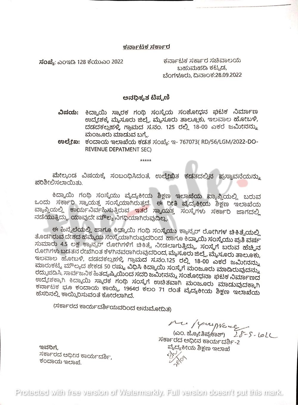 ಮೈಸೂರು ಜಿಲ್ಲೆ ಮೈಸೂರು ತಾಲೂಕಿನ ಇಲವಾಲ ಹೋಬಳಿಯ ದಡದಕಲ್ಲಹಳ್ಳಿ ಗ್ರಾಮದ ಸರ್ವೆ ನಂಬರ್ 125ರಲ್ಲಿ 18 ಎಕರೆ ಜಮೀನನ್ನು ಮಾರುಕಟ್ಟೆ ಮೌಲ್ಯದ ಶೇ.50ರಷ್ಟು ವಿಧಿಸಿ ಕಿದ್ವಾಯಿ ಸಂಸ್ಥೆಗೆ ಮಂಜೂರು ಮಾಡಿರುವುದನ್ನು ರದ್ದುಪಡಿಸಿ ಸಾರ್ವಜನಿಕ ಹಿತದೃಷ್ಟಿಯಿಂದ ಈ ಜಮೀನನ್ನು ಸಂಶೋಧನಾ ಘಟಕ ನಿರ್ಮಾಣದ ಉದ್ದೇಶಕ್ಕಾಗಿ ಕಿದ್ವಾಯಿ ಸ್ಮಾರಕ ಗಂಥಿ ಸಂಸ್ಥೆಗೆ ಕರ್ನಾಟಕ ಭೂ ಕಂದಾಯ ಕಾಯ್ದೆ ಕಲಂ 71ರಂತೆ ಉಚಿತವಾಗಿ ಮಂಜೂರು ಮಾಡಬೇಕು. ಮತ್ತು ಇದನ್ನು ವೈದ್ಯಕೀಯ ಶಿಕ್ಷಣ ಇಲಾಖೆಯ ಹೆಸರಿನಲ್ಲಿ ಕಾಯ್ದಿರಿಸಬೇಕು ಎಂದು ವೈದ್ಯಕೀಯ ಶಿಕ್ಷಣ ಇಲಾಖೆಯ ಸರ್ಕಾರದ ಅಧೀನ ಕಾರ್ಯದರ್ಶಿ ಅವರು ಪತ್ರದಲ್ಲಿ ಕೋರಿದ್ದಾರೆ.