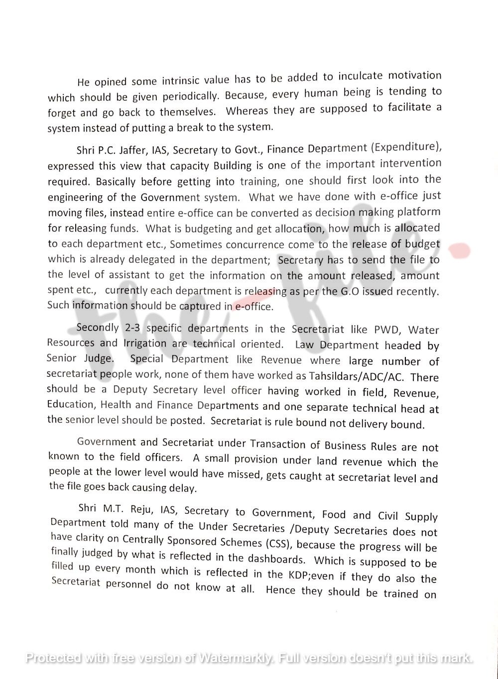 ಸಚಿವಾಲಯ, ನಿರ್ದೇಶನಾಲಯ ಮತ್ತು ಕಾರ್ಯಕ್ಷೇತ್ರಗಳಲ್ಲಿ ಕಾರ್ಯನಿರ್ವಹಿಸುತ್ತಿರುವ ಅಧಿಕಾರಿ, ನೌಕರರ ಕಾರ್ಯಕ್ಷಮತೆ, ದಕ್ಷತೆ ಕುರಿತು ಸಭೆಯಲ್ಲಿ ಚರ್ಚಿಸಲಾಗಿದೆಯಲ್ಲದೇ ಅಧಿಕಾರಿ, ನೌಕರರಿಗೆ ಹಲವು ಹಂತಗಳಲ್ಲಿ ತರಬೇತಿಯ ಅವಶ್ಯಕತೆ ಇದೆ ಎಂದು ವಿಶ್ಲೇಷಿಸಿರುವುದು ಸಭೆಯ ನಡವಳಿಯಿಂದ ತಿಳಿದು ಬಂದಿದೆ.