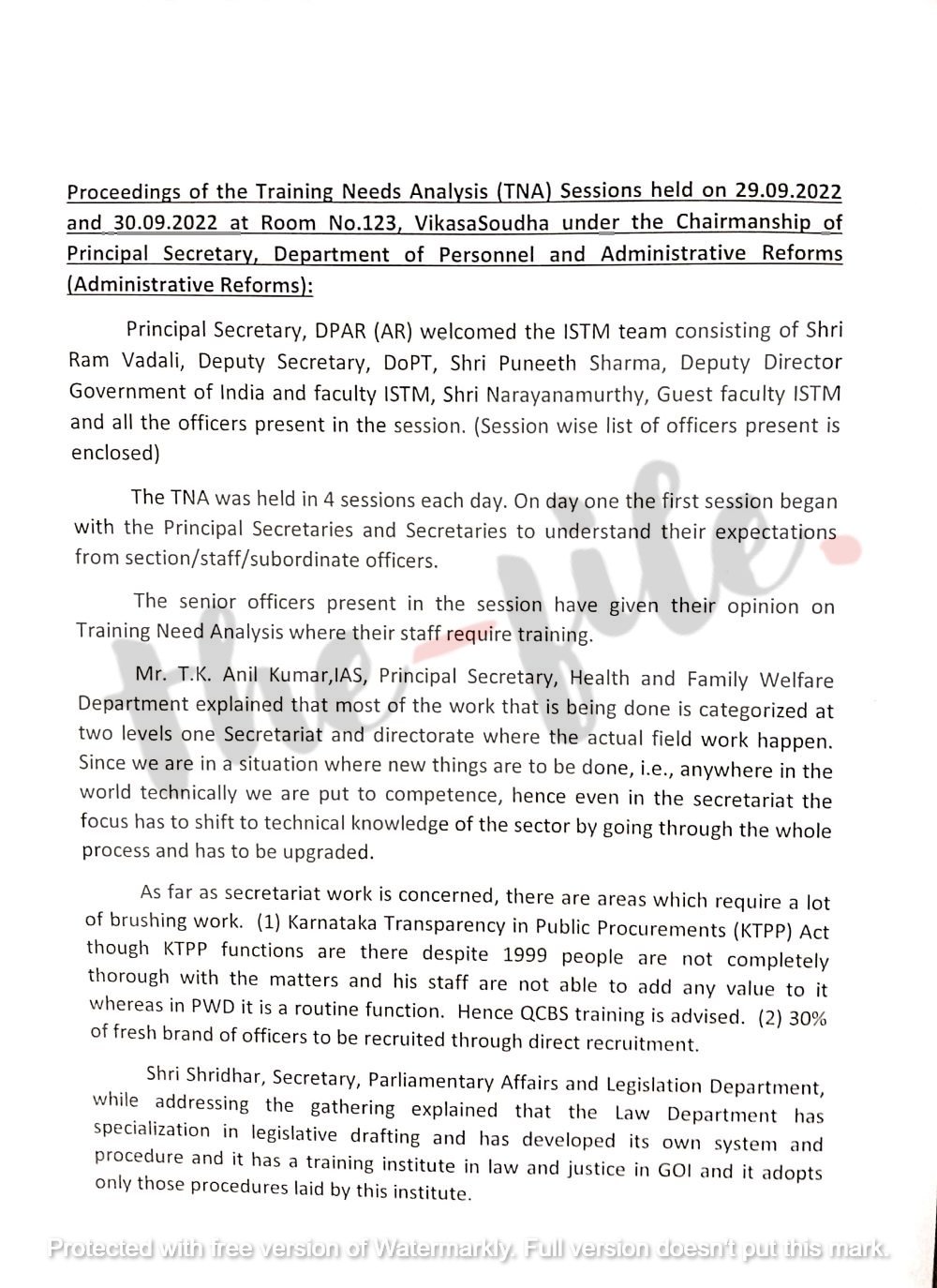ಆಡಳಿತಾತ್ಮಕ ಸುಧಾರಣೆ ಮತ್ತು ತರಬೇತಿ ನೀಡುವ ನಿಟ್ಟಿನಲ್ಲಿ 2022ರ ಸೆ.29ರಂದು ಸಿಬ್ಬಂದಿ ಮತ್ತು ಆಡಳಿತ ಸುಧಾರಣೆ ಇಲಾಖೆಯ ಪ್ರಧಾನ ಕಾರ್ಯದರ್ಶಿ ಅಧ್ಯಕ್ಷತೆಯಲ್ಲಿ ನಡೆದ ಸಭೆಯಲ್ಲಿ ಪ್ರಧಾನ ಕಾರ್ಯದರ್ಶಿ, ಕಾರ್ಯದರ್ಶಿ ಹಂತದ ಐಎಎಸ್‌ ಅಧಿಕಾರಿಗಳು ಸಾರ್ವಜನಿಕ ಆಡಳಿತದಲ್ಲಿನ ಮಧ್ಯಮ ಮತ್ತು ಕೆಳಹಂತದ ಅಧಿಕಾರಿ, ನೌಕರರ ಕಾರ್ಯಕ್ಷಮತೆಯನ್ನು ಒರೆಗೆ ಹಚ್ಚಿದ್ದಾರೆ.