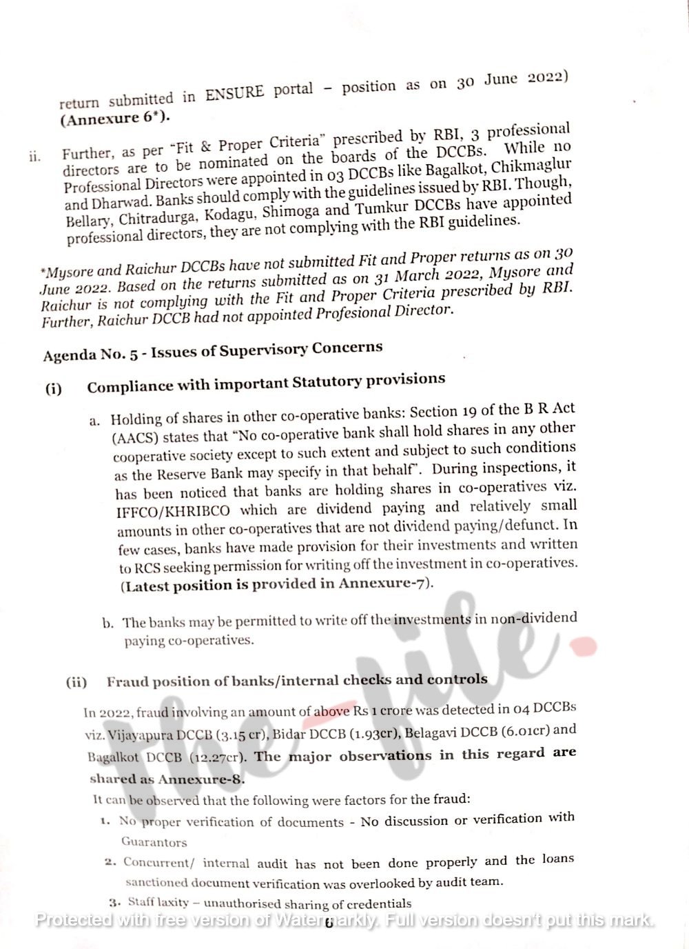 ಈ ಜಿಲ್ಲಾ ಕೇಂದ್ರ ಸಹಕಾರ ಬ್ಯಾಂಕ್‌ಗಳಲ್ಲಿ ಆಂತರಿಕ ಲೆಕ್ಕಪರಿಶೋಧನೆ ಕ್ರಮಬದ್ಧವಾಗಿ ನಡೆದಿಲ್ಲ. ಸಾಲ ಮಂಜೂರು ಮಾಡಿದ ಪ್ರಕರಣಗಳಿಗೆ ಸಂಬಂಧಿಸಿದಂತೆ ದಾಖಲಾತಿಗಳನ್ನು ಬ್ಯಾಂಕ್‌ನ ಆಂತರಿಕ ಲೆಕ್ಕಪರಿಶೋಧಕರು ಪರಿಶೀಲನೆಗೆ ಒಳಪಡಿಸಿಲ್ಲ. ವ್ಯವಸ್ಥೆಯಲ್ಲಿನ ದೌರ್ಬಲ್ಯಗಳು ಮತ್ತು ಆಂತರಿಕ ಆಡಳಿತದಲ್ಲಿನ ಲೋಪ ದೋಷಗಳಿಂದಾಗಿ ಬ್ಯಾಂಕ್‌ಗಳ ಹಣಕಾಸು ವಹಿವಾಟಿನಲ್ಲಿ ಅವ್ಯವಹಾರಗಳು ನಡೆಯುತ್ತಿವೆ ಎಂದು ಕಾರ್ಯಸೂಚಿಯ ಪಟ್ಟಿಯಲ್ಲಿ ವಿವರಿಸಲಾಗಿದೆ.