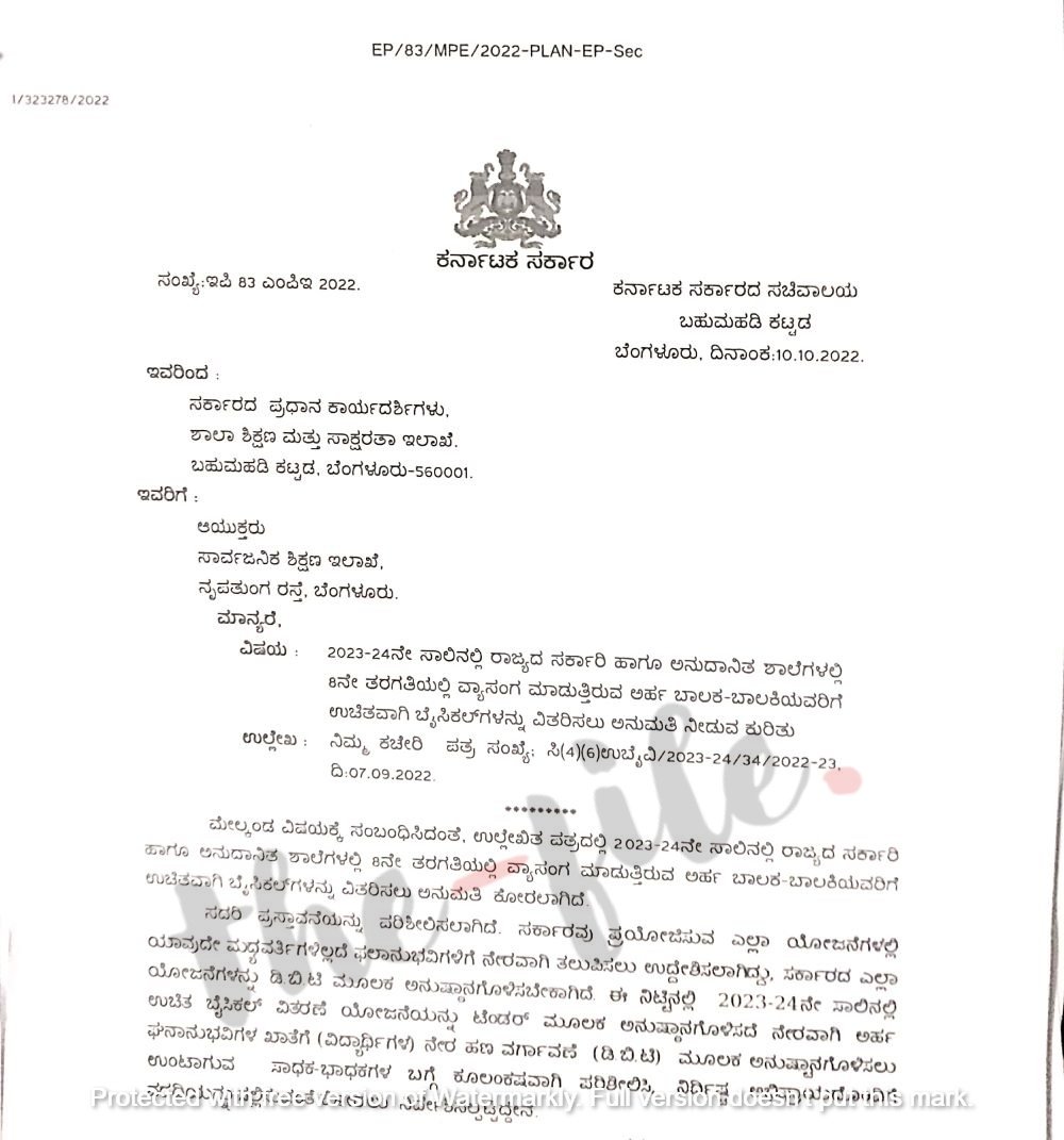 ಉಚಿತ ಬೈಸಿಕಲ್ ವಿತರಿಸುವ ಸಂಬಂಧ ಅನುಮತಿ ಕೋರಿ ಸಾರ್ವಜನಿಕ ಶಿಕ್ಷಣ ಇಲಾಖೆಯ ಆಯುಕ್ತರು 2022ರ ಸೆಪ್ಟಂಬರ್ 7ರಂದು ಸರ್ಕಾರಕ್ಕೆ ಪತ್ರ ಬರೆದಿದ್ದರು. ಈ ಪತ್ರವನ್ನು ಪರಿಶೀಲಿಸಿರುವ ಸರ್ಕಾರವು ‘ ಸರ್ಕಾರವು ಪ್ರಾಯೋಜಿಸುವ ಎಲ್ಲಾ ಯೋಜನೆಗಳಲ್ಲಿ ಯಾವುದೇ ಮಧ್ಯವರ್ತಿಗಳಿಲ್ಲದೇ ಫಲಾನುಭವಿಗಳಿಗೆ ನೇರವಾಗಿ ತಲುಪಿಸಲು ಉದ್ದೇಶಿಸಲಾಗಿದೆ. ಸರ್ಕಾರದ ಎಲ್ಲಾ ಯೋಜನೆಗಳನ್ನು ಡಿಬಿಟಿ ಮೂಲಕ ಅನುಷ್ಠಾನಗೊಳಿಸಬೇಕಿದೆ. ಈ ನಿಟ್ಟಿನಲ್ಲಿ 2023-24ನೇ ಸಾಲಿನಲ್ಲಿ ಉಚಿತ ಬೈಸಿಕಲ್ ವಿತರಣೆ ಯೋಜನೆಯನ್ನು ಟೆಂಡರ್ ಮೂಲಕ ಅನುಷ್ಠಾನಗೊಳಿಸದೇ ನೇರವಾಗಿ ಅರ್ಹ ಫಲಾನುಭವಿಗಳ ಖಾತೆಗೆ ನೇರ ಹಣ ವರ್ಗಾವಣೆ (ಡಿಬಿಟಿ) ಅನುಷ್ಠಾನಗೊಳಿಸಲು ಉಂಟಾಗುವ ಸಾಧಕಬಾಧಕಗಳ ಕುರಿತು ಪರಿಶೀಲಿಸಿ ನಿರ್ದಿಷ್ಟ ಅಭಿಪ್ರಾಯದೊಂದಿಗೆ ವರದಿ ಸಲ್ಲಿಸಬೇಕು,’ ಎಂದು ಶಾಲಾ ಶಿಕ್ಷಣ ಮತ್ತು ಸಾಕ್ಷರತಾ ಇಲಾಖೆಯ ಸರ್ಕಾರದ ಪ್ರಧಾನ ಕಾರ್ಯದರ್ಶಿಗಳು ಆಯುಕ್ತರಿಗೆ ಪತ್ರ ಬರೆದಿದ್ದಾರೆ.