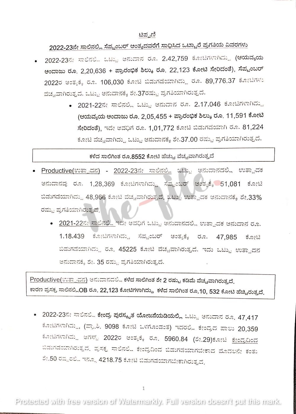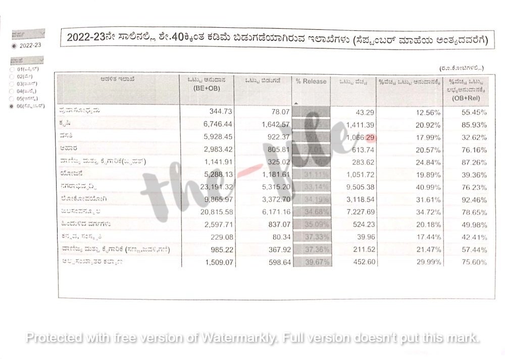 2022-23ನೇ ಸಾಲಿನ ಆಯವ್ಯಯದಲ್ಲಿ ನಿಗದಿಪಡಿಸಿದ್ದ ಒಟ್ಟು ಅನುದಾನಕ್ಕೆ ಸೆಪ್ಟಂಬರ್ 2022ರ ಅಂತ್ಯಕ್ಕೆ ಒಟ್ಟು ವೆಚ್ಚ ಮಾಡಿರುವ ಕುರಿತು ಮುಖ್ಯ ಕಾರ್ಯದರ್ಶಿ ವಂದಿತಾ ಶರ್ಮ ಅಧ್ಯಕ್ಷತೆಯಲ್ಲಿ ನಡೆದಿದ್ದ ಸಭೆಯಲ್ಲಿ ಇಲಾಖೆಗಳು ಮಾಡಿರುವ ವೆಚ್ಚದ ವಿವರಗಳು ಬಹಿರಂಗವಾಗಿವೆ. ತುಲನಾತ್ಮಕ ವೆಚ್ಚದ ವಿವರಗಳು ‘ದಿ ಫೈಲ್’ಗೆ ಲಭ್ಯವಾಗಿವೆ.