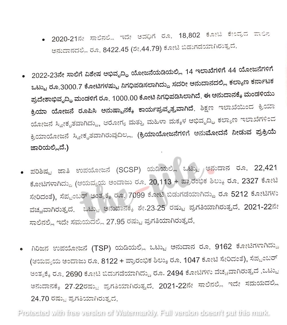 ಪರಿಶಿಷ್ಟ ಜಾತಿ ಉಪಯೋಜನೆಯಡಿಯಲ್ಲಿ 2022-23ನೇ ಸಾಲಿನ ಒಟ್ಟು ಅನುದಾನದ 22,421 ಕೋಟಿ ರು. ಪೈಕಿ ಸೆಪ್ಟಂಬರ್ ಅಂತ್ಯಕ್ಕೆ 7,099 ಕೋಟಿ ರು. ಬಿಡುಗಡೆಯಾಗಿದೆ. ಇರಲ್ಲಿ 5,212 ಕೋಟಿ ರು. ವೆಚ್ಚವಾಗಿದೆ. ಒಟ್ಟು ಅನುದಾನಕ್ಕೆ ಶೇ.23.25ರಷ್ಟು ಪ್ರಗತಿಯಾಘಿದೆ. 2021-22ನೇ ಸಾಲಿನಲ್ಲಿಯೂ ಇದೇ ಸಮಯದಲ್ಲಿ ಶೇ.27.95ರಷ್ಟು ಪ್ರಗತಿಯಾಗಿತ್ತು.