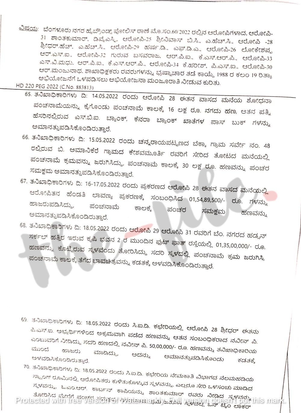 ’29ನೇ ಆರೋಪಿ ಹರ್ಷ ಡಿ ಎಂಬಾತ ಡಿವೈಎಸ್ಪಿ ಶಾಂತಕುಮಾರ್ಗೆ ಬೆಂಗಳೂರು ನಗರದ ಹಡ್ಸನ್ ಸರ್ಕಲ್ ಬಳಿ ಇರುವ ಕೃಷಿ ಭವನದ ಮುಂದಿನ ಫುಟ್ಪಾತ್ ರಸ್ತೆಯಲ್ಲಿ 1,35,00,000 ರುಗ.ಳನ್ನು ನೀಡಿದ್ದ,’ ಎಂದು ಮಾಹಿತಿ ಒದಗಿಸಿದ್ದಾರೆ.