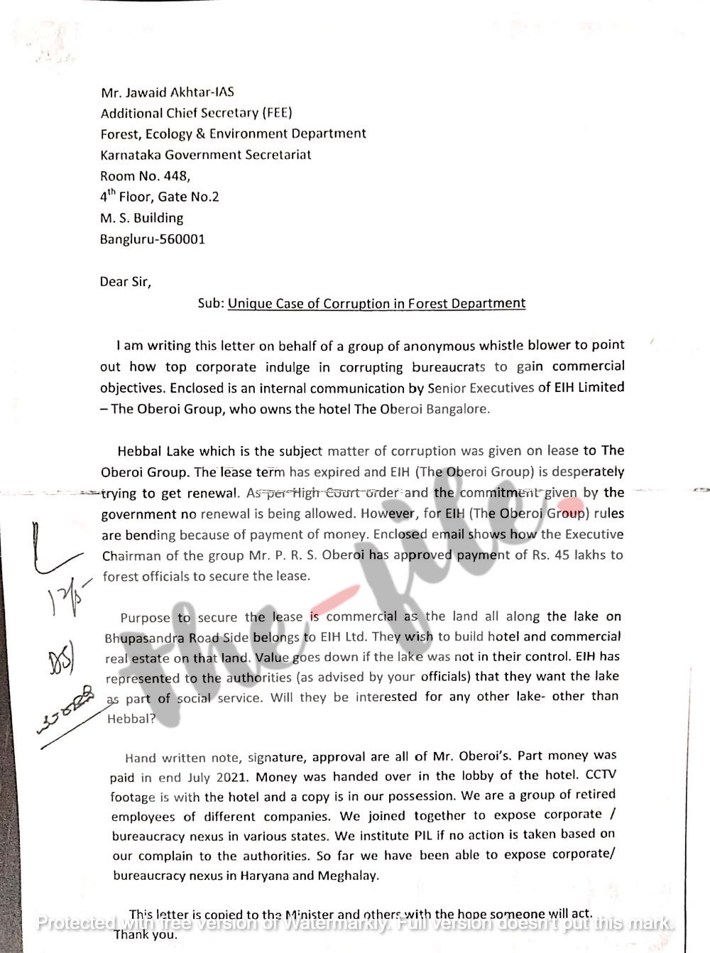ಬೆಂಗಳೂರು; ಈಸ್ಟ್ ಇಂಡಿಯಾ ಹೋಟೆಲ್ಸ್ಗೆ (ಒಬೆರಾಯ್ ಗ್ರೂಪ್) ಬೆಂಗಳೂರಿನ ಹೆಬ್ಬಾಳ ಕೆರೆ ಅಭಿವೃದ್ಧಿ ಗುತ್ತಿಗೆ ನೀಡಲು ಮಾಡಿರುವ ಶಿಫಾರಸ್ಸಿನ ಪ್ರಸ್ತಾವನೆ ಹಿಂದೆ ಭ್ರಷ್ಟಾಚಾರ ನಡೆದಿದೆ ಎಂದು ಅರಣ್ಯ ಇಲಾಖೆಯ ಸರ್ಕಾರದ ಹೆಚ್ಚುವರಿ ಮುಖ್ಯ ಕಾರ್ಯದರ್ಶಿಗೆ ಮಹತ್ವದ ಸುಳಿವು ನೀಡಿರುವ ವಿವಿಧ ಕಂಪನಿಗಳ ನಿವೃತ್ತ ಅಧಿಕಾರಿಗಳ ಸಮೂಹದ ರಹಸ್ಯ ಬೇಧಕರೊಬ್ಬರು (Whistle Blower) ಕಾರ್ಪೋರೇಟ್ ಕಂಪನಿಗಳು ಹೇಗೆ ಅಧಿಕಾರಶಾಹಿಯನ್ನು ಭ್ರಷ್ಟಗೊಳಿಸಿದೆ ಎಂಬುದನ್ನು ಹೊರಗೆಡವಿದ್ದಾರೆ.