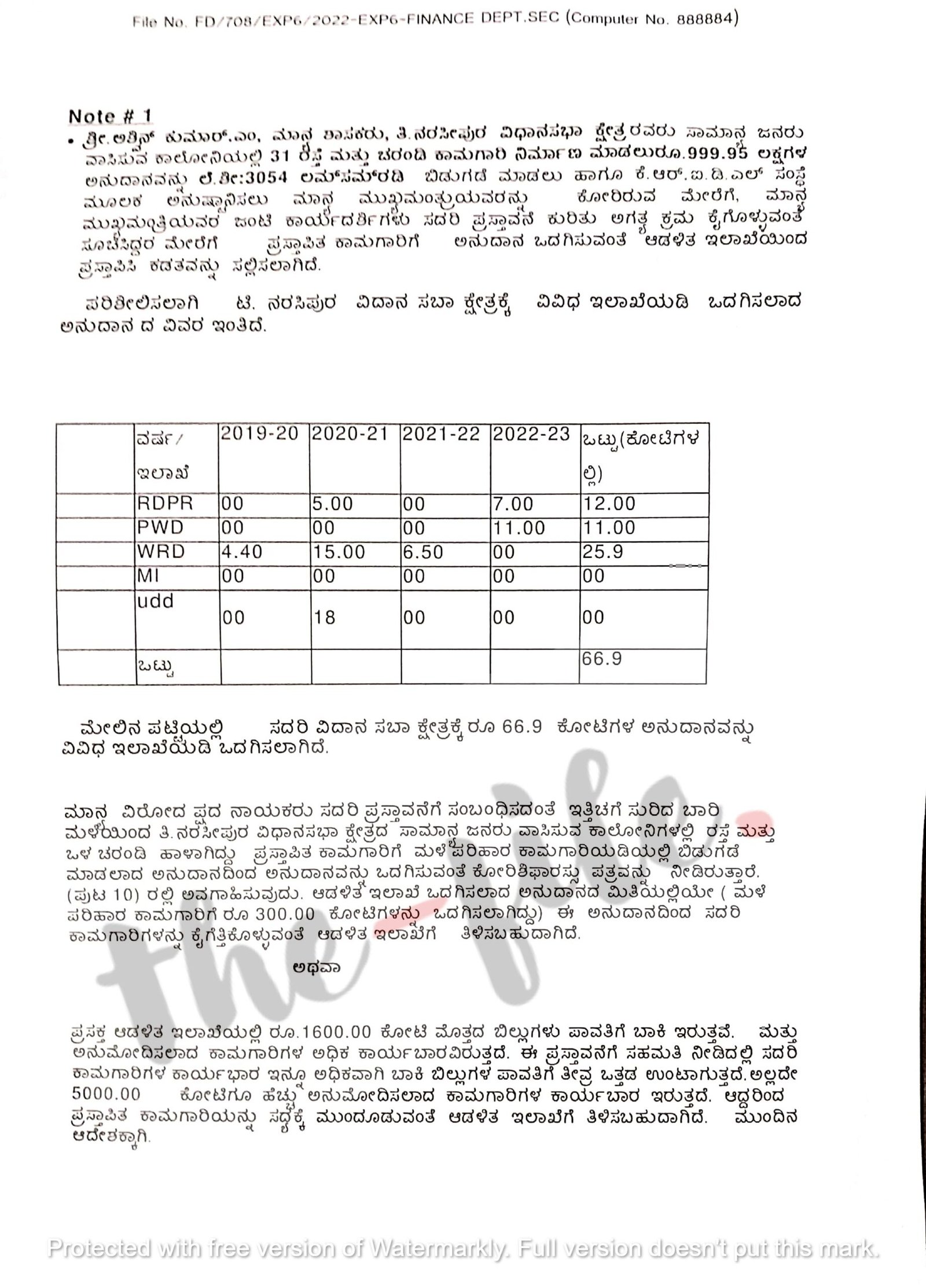 ಅದೇ ರೀತಿ ಟಿ ನರಸೀಪುರ ಶಾಸಕ ಅಶ್ವಿನ್ ಕುಮಾರ್ ಅವರು ಇಲಾಖೆಗೆ ಪ್ರಸ್ತಾವನೆ ಸಲ್ಲಿಸಿದ್ದಾರೆ. ಸಾಮಾನ್ಯ ಜನರು ವಾಸಿಸುವ ಕಾಲೋನಿಯಲ್ಲಿ 31 ರಸ್ತೆ ಮತ್ತು ಚರಂಡಿ ಕಾಮಗಾರಿ ನಿರ್ಮಾಣ ಮಾಡಲು 999.95 ಲಕ್ಷ ರು. ಅನುದಾನವನ್ನು (ಲೆಕ್ಕ ಶೀರ್ಷಿಕೆ 3054 ಅಡಿ )ಬಿಡುಗಡೆ ಮಾಡಬೇಕು ಮತ್ತು ಕೆಆರ್ಐಡಿಎಲ್ ಮೂಲಕ ಅನುಷ್ಠಾನಗೊಳಿಸಬೇಕು ಎಂದು ಮುಖ್ಯಮಂತ್ರಿಗೆ ಕೋರಿದ್ದಾರೆ. ಈಗಾಗಲೇ ಟಿ ನರಸೀಪುರ ಕ್ಷೇತ್ರಕ್ಕೆ 66.9 ಕೋಟಿ ರು.ಗಳ ಅನುದಾನವನ್ನು ವಿವಿಧ ಇಲಾಖೆಯಡಿ ಒದಗಿಸಲಾಗಿದೆ.