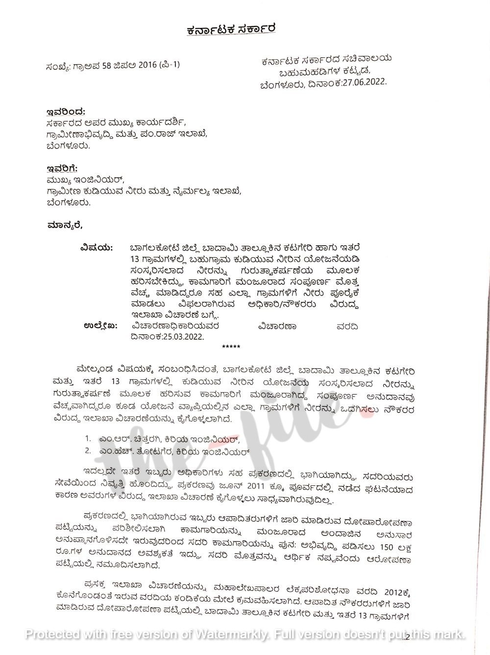ಬಾಗಲಕೋಟೆಯ ಬಾದಾಮಿ ತಾಲೂಕಿನ ಕಟೆಗೇರಿ ಮತ್ತಿತರ 13 ಗ್ರಾಮಗಳಲ್ಲಿ ಬಹುಗ್ರಾಮ ಕುಡಿಯುವ ನೀರು ಯೋಜನೆ ಸಂಸ್ಕರಿಸಲಾದ ನೀರನ್ನು ಗುರುತ್ವಾಕರ್ಷಣೆ ಮೂಲಕ ಹರಿಸುವ ಕಾಮಗಾರಿಗೆ ಮಂಜೂರಾಗಿದ್ದ ಸಂಪೂರ್ಣ ಅನುದಾನ ವೆಚ್ಚವಾಗಿತ್ತು. ಆದರೆ ಯೋಜನೆ ವ್ಯಾಪ್ತಿಯಲ್ಲಿನ ಎಲ್ಲಾ ಗ್ರಾಮಗಳಿಗೆ ನೀರನ್ನು ಒದಗಿಸುವಲ್ಲಿ ಕಿರಿಯ ಇಂಜಿನಿಯರ್ಗಳು ವಿಫಲರಾಗಿದ್ದರು. ಈ ಸಂಬಂಧ ಕ್ರಮಕೈಗೊಳ್ಳುವಂತೆ ಗ್ರಾಮೀಣಾಭಿವೃದ್ಧಿ ಮತ್ತು ಪಂಚಾಯತ್ರಾಜ್ ಇಲಾಖೆಯ ಸರ್ಕಾರದ ಹೆಚ್ಚುವರಿ ಮುಖ್ಯ ಕಾರ್ಯದರ್ಶಿ ಎಲ್ ಕೆ ಅತೀಕ್ ಅವರು ಯೋಜನೆಯ ಮುಖ್ಯ ಇಂಜನಿಯರ್ಗೆ 2022ರ ಜೂನ್ 27ರಂದು ಪತ್ರ ಬರೆದಿದ್ದಾರೆ. ಈ ಪತ್ರದ ಪ್ರತಿಯು ‘ದಿ ಫೈಲ್’ಗೆ ಲಭ್ಯವಾಗಿದೆ.