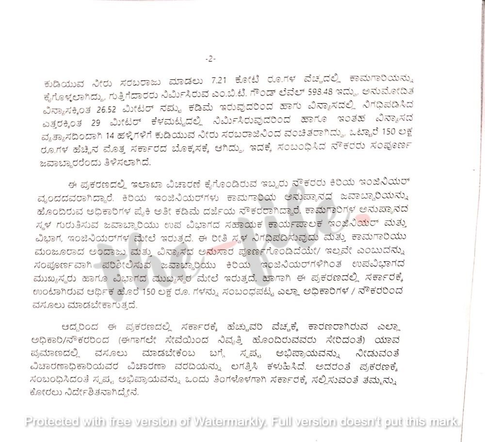 ಬಾದಾಮಿ ತಾಲೂಕಿನ ಕಟಗೇರಿ ಮತ್ತು ಇತರೆ 13 ಗ್ರಾಮಗಳಿಗೆ ಕುಡಿಯುವ ನೀರು ಸರಬರಾಜು ಮಾಡಲು 7.21 ಕೋಟಿ ವೆಚ್ಚದಲ್ಲಿ ಕಾಮಗಾರಿ ಕೈಗೆತ್ತಿಕೊಳ್ಳಲಾಗಿತ್ತು. ಗುತ್ತಿಗೆದಾರರು ನಿರ್ಮಿಸಿದ್ದ ಎಂಬಿಟಿ ಗ್ರೌಂಡ್ ಲೆವೆಲ್ 598.48 ಇತ್ತು. ಅನುಮೋದಿತ ವಿನ್ಯಾಸಕ್ಕಿಂತ 26.52 ಮೀಟರ್ನಷ್ಟು ಕಡಿಮೆ ಇತ್ತು. ಹಾಗೂ ವಿನ್ಯಾಸದಲ್ಲಿ ನಿಗದಿಪಡಿಸಿದ್ದ ಎತ್ತರಕ್ಕಿಂತ 29 ಮೀರ್ ಕೆಳಮಟ್ಟದಲ್ಲಿ ನಿರ್ಮಾಣವಾಗಿತ್ತು. ವಿನ್ಯಾಸದಲ್ಲಿನ ಇಂತಹ ವ್ಯತ್ಯಾಸದಿಂದಾಗಿ 14 ಹಳ್ಳಿಗಳಿಗೆ ಕುಡಿಯುವ ನೀರು ಸರಬರಾಜಿನಿಂದ ವಂಚಿತವಾಗಿತ್ತು ಎಂಬ ಸಂಗತಿಯು ಪತ್ರದಿಂದ ಗೊತ್ತಾಗಿದೆ.