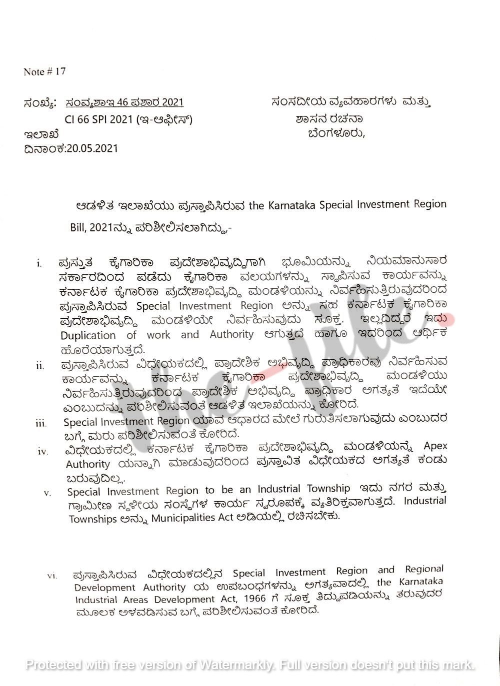 ಪ್ರಸ್ತಾಪಿಸಿರುವ ವಿಧೇಯಕದಲ್ಲಿನ Special Investment Region and Regional Development Authorityಯ ಉಪ ಬಂಧಗಳನ್ನು ಅಗತ್ಯವಾದಲ್ಲಿ the karnataka industrial area developement act 1966ಗೆ ಸೂಕ್ತ ತಿದ್ದುಪಡಿಯನ್ನು ತರುವುದರ ಮೂಲಕ ಅಳವಡಿಸುವ ಬಗ್ಗೆ ಪರಿಶೀಲಿಸುವಂತೆ ಕೋರಿರುವುದು ತಿಳಿದು ಬಂದಿದೆ.