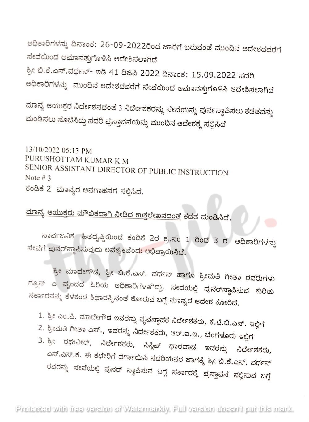 ಈ ಸಂಬಂಧ ಸಾರ್ವಜನಿಕ ಶಿಕ್ಷಣ ಇಲಾಖೆಯ ಆಯುಕ್ತ ವಿಶಾಲ್ ಅವರು ಮೌಖಿಕ ಸೂಚನೆ ಮೇರೆಗೆ ಅಧಿಕಾರಿಗಳು ಕಡತವನ್ನು ಮಂಡಿಸಿದ್ದಾರೆ. ಇದರಲ್ಲಿ ‘ ಸಾರ್ವಜನಿಕ ಹಿತದೃಷ್ಟಿಯಿಂದ ಮಾದೇಗೌಡ, ಬಿ ಕೆ ಎಸ್ ವರ್ಧನ್, ಗೀತಾ ಅವರು ಎ ವೃಂದದ ಹಿರಿಯ ಅಧಿಕಾರಿಗಳಾಗಿದ್ದು ಸಾರ್ವಜನಿಕ ಹಿತದೃಷ್ಟಿಯಿಂದ ಇವರನ್ನು ಸೇವೆಗೆ ಪುನರ್ ಸ್ಥಾಪಿಸುವುದು ಅವಶ್ಯಕವಾಗಿದೆ,’ ಎಂದು ಆಯುಕ್ತರ ಕಚೇರಿ ಅಧಿಕಾರಿಗಳು ಟಿಪ್ಪಣಿ ಹಾಕಿರುವುದು ತಿಳಿದು ಬಂದಿದೆ.